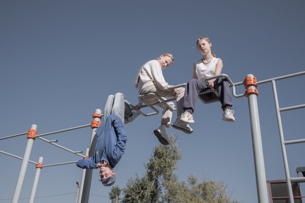 Егор, Ира и Нина на детской площадке на территории деревни «Виктория»Фото: Наташа Лозинская для ТД Этот снимок я сделала в «Детской Деревне» в Армавире, где живут семьи с приемными детьми — «На деревню Глебушке». В других областях уже стояла осень, а в Краснодарском крае была жара, солнечно, и вся «Деревня» — в зелени и цветах. На самом деле это оказалась не совсем деревня, а коттеджный поселок. Меня поразило, как там все устроено: высокие краснокирпичные дома, ухоженная территория, детские площадки и мастерские, террасы для чаепитий, велодорожки и детские площадки. Дети в тот день высыпали на улицу, потому что был выходной и хорошая погода. Это очень напомнило мне мое собственное детство, когда ватаги мальчишек и девчонок носились и играли во дворах, без гаджетов и интернета.