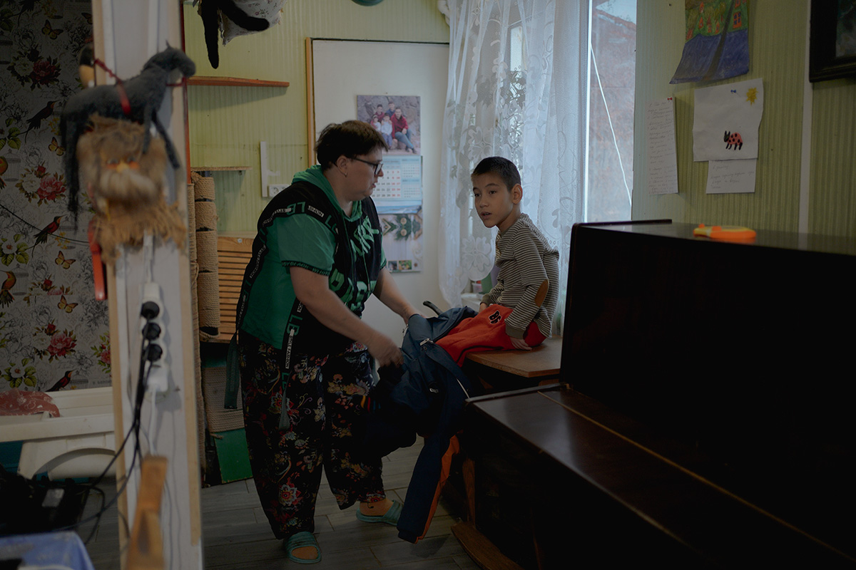 Мама Никиты собирает его на улицу для прогулки на лошади, деревня Чупряково Московской области. У семьи есть собственная лошадь, иппотерапия очень помогает в реабилитации ребятамФото: Мария Гельман для ТД * * *