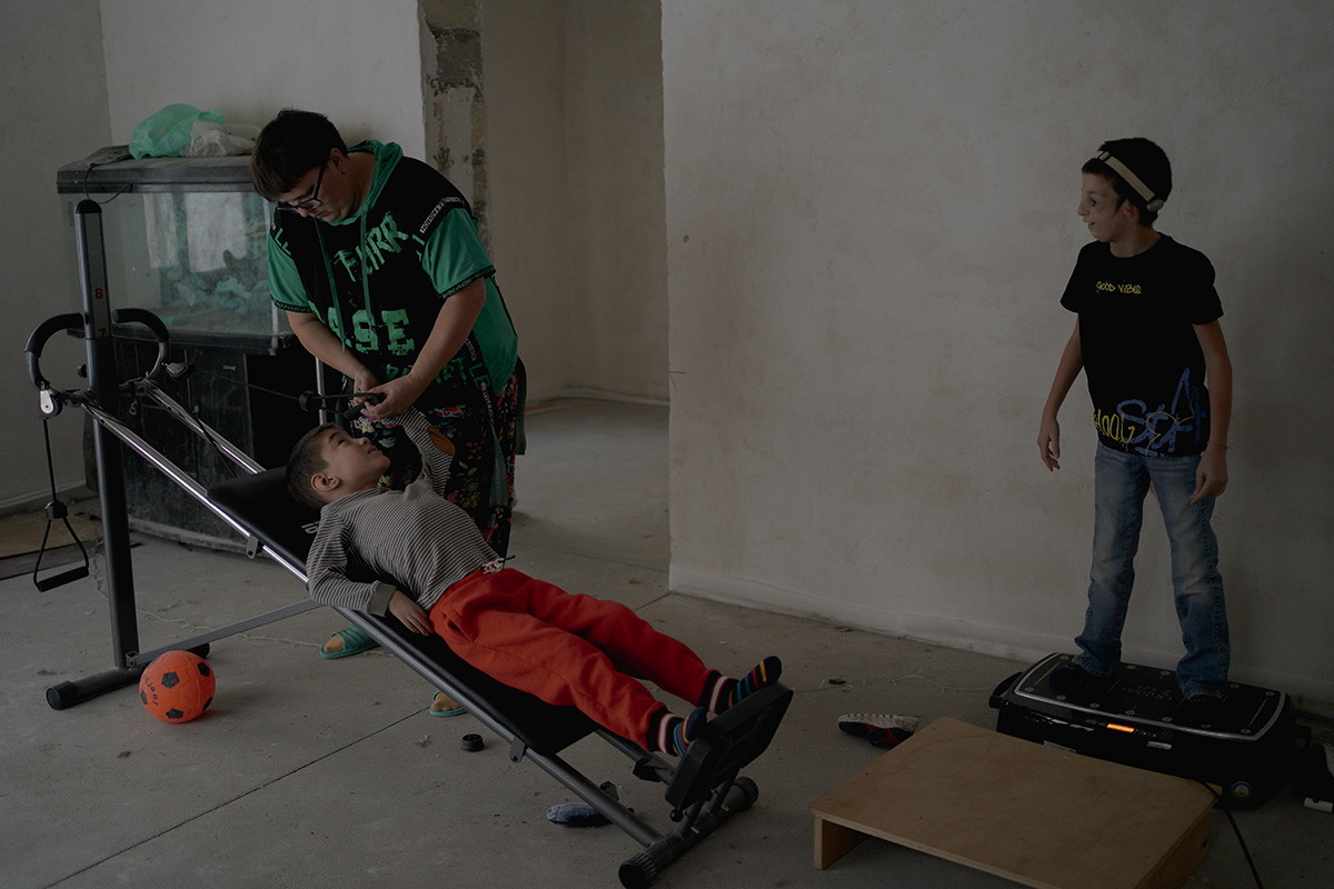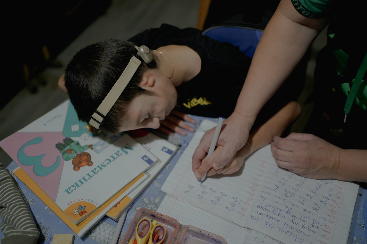 Никита делает домашнее задание в гостиной дома, деревня Чупряково Московской области. Из-за слабых рук он прикладывает значительные усилия, чтобы достать учебники и тетради, поэтому иногда помогает себе зубамиФото: Мария Гельман для ТД «Если бы не фонд, мы бы это все не потянули», — говорит Анна. Она работает ветврачом, муж Евгений — сисадмином. У семьи свой деревенский дом, несколько собак и лошадь — она тоже помогает детям реабилитироваться.