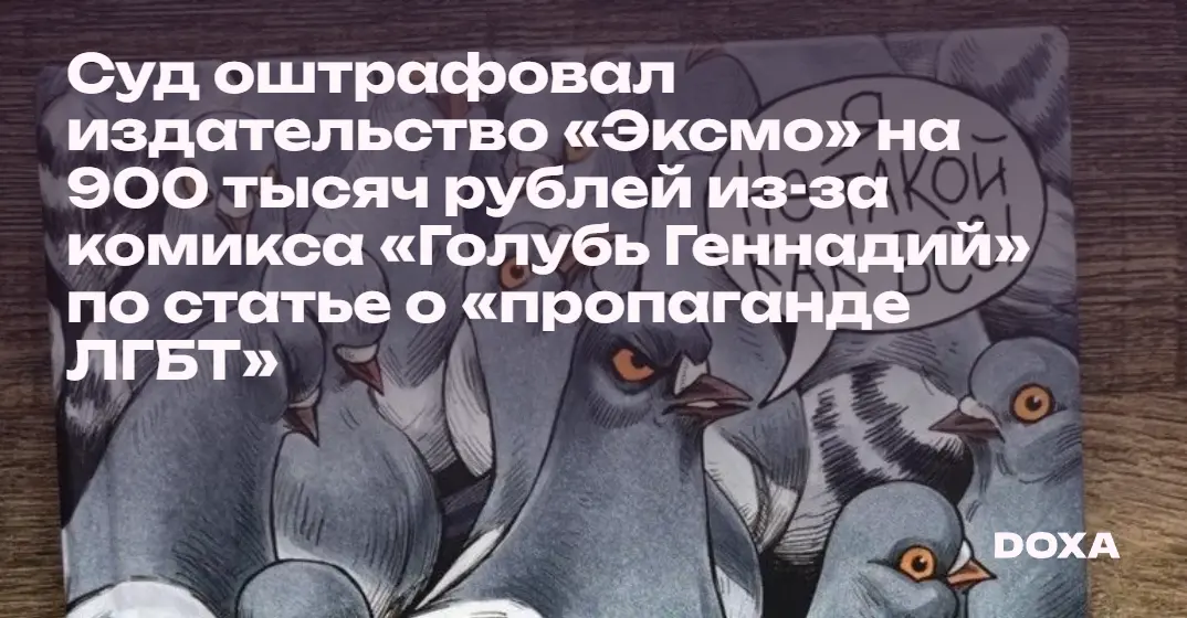 Зеленоградский районный суд Москвы постановил назначить административный штраф издательству «Эксмо» по статье о «пропаганде ЛГБТ+», которая, по мнению суда, содержится в комиксе «Голубь Геннадий». Издательство оштрафовано на 900 тысяч рублей.