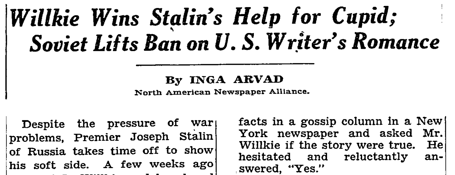 И опять ошибка. Гилмор действительно обратился к высокопоставленному американскому политику. Но это был не Уоллес, а Вэнделл Уилки – соперник Рузвельта на президентских выборах 1940 года, а в 1941–1942 годах его личный спецпредставитель. В этом качестве он посетил Великобританию, где с ним и познакомился Гилмор, а в сентябре 1942-го прилетел в СССР – сначала в Куйбышев (и Гилмор опять-таки был в числе освещавших его визит репортеров), затем в Москву для встречи со Сталиным. Вернувшись в США, он проявил себя как активный сторонник открытия второго фронта и сделался любимцем советской пропаганды. К тому же Сталин рассчитывал, что в 1944 году Уилки будет снова избираться в президенты. О таком лояльном кандидате Москва могла только мечтать.