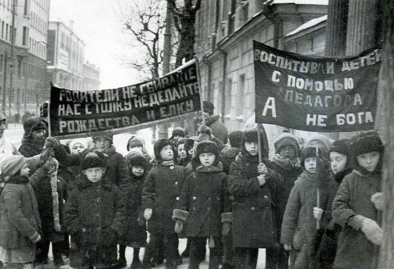 «Родители, не сбивайте нас с толку — не делайте рождества и ёлку», «Воспитывай детей с помощью педагога, а не бога»: воспитанники московского детсада на антирождественской демонстации, 1929 год