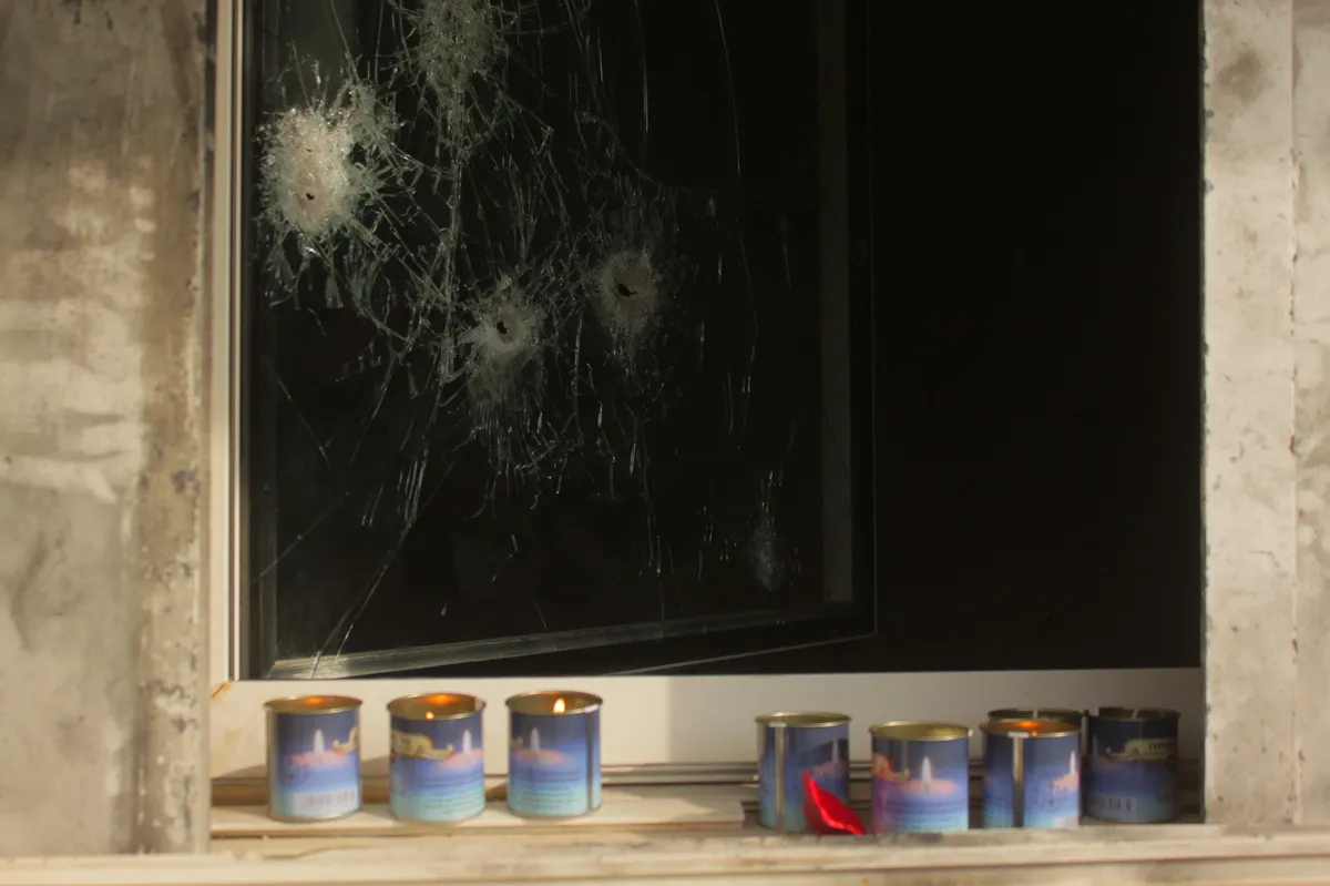 В доме заметны многочисленные дыры от выпущенных пуль, вещи сломаны и разбросаны, всё в грязи.