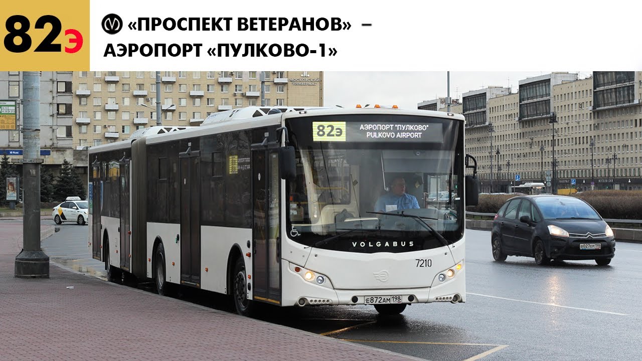 Детали. Автобус № 82Э отъезжает от метро «Проспект Ветеранов», а затем едет по Дачному проспекту, КАД и Пулковскому шоссе до аэропорта. Ежедневно будут курсировать семь двухсекционных автобусов. Интервал движения составит 15 минут. График работы — с 6:00 до 1:40.