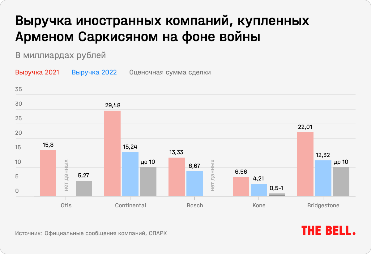 Все эти покупки тоже прошли с дисконтом. Сделку с Continental источники «Коммерсанта» оценивали в сумму не более 10 млрд рублей при стоимости активов компании на конец 2022 года 22 млрд рублей. Точно такое же соотношение — и в сделке с Bridgestone: до войны стоимость ее активов составляла 23 млрд рублей, а Саркисян предположительно заплатил за компанию 7–10 млрд рублей.
