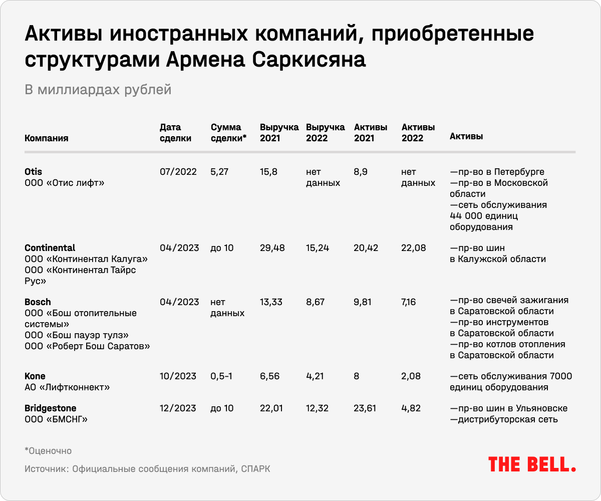За этой сделкой последовали другие. В апреле 2023 года Саркисян купил три завода немецкой Bosch в Энгельсе (Саратовская область) — по производству свечей зажигания, котлов отопления и электроинструментов. В мае — шинный завод и дистрибуторскую компанию немецкой Continental в Калужской области. В октябре — российские активы финского производителя лифтов Kone. Наконец, на прошлой неделе S8 Capital Саркисяна объявила о покупке шинного завода японской Bridgestone в Ульяновской области. Вместе с купленной в мае (уже у российского собственника) компанией Cordiant эти приобретения сделали Саркисяна вторым игроком на российском шинном рынке.