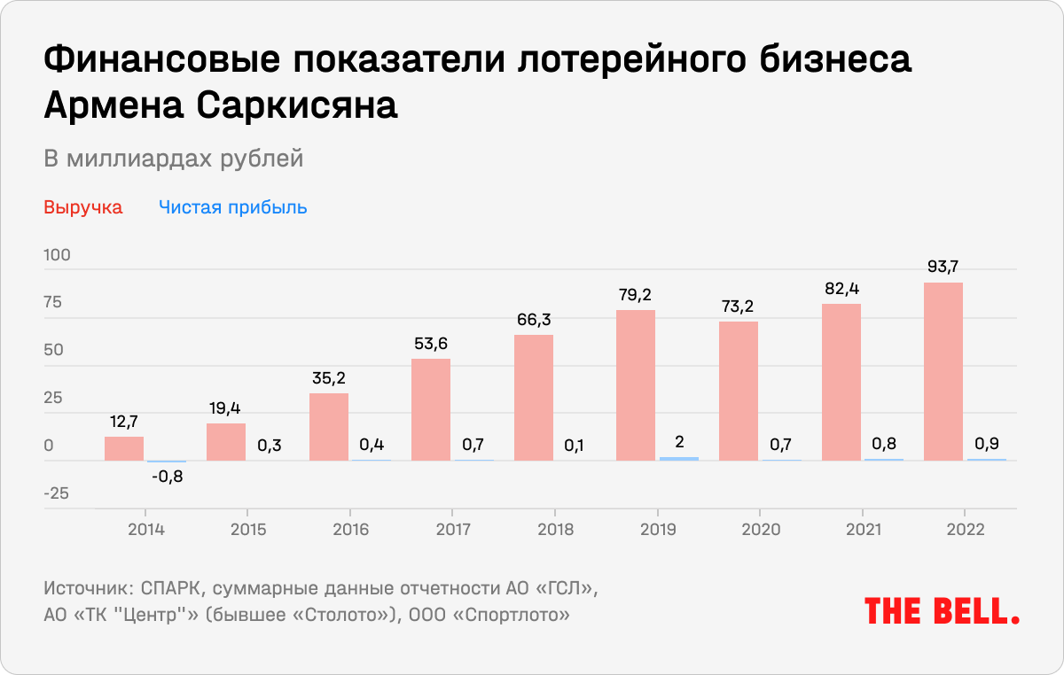 Лотерейный бизнес принес Саркисяну и его семье богатство. Выручка его лотерейных компаний приближается к 100 млрд рублей. Чистая прибыль — лишь однажды превысила 1 млрд рублей в год, но в лотерейном бизнесе заработок компании может прятаться в других строчках отчетности, писали «Ведомости».