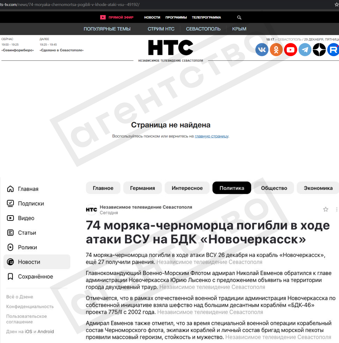 О содержании удаленной новости на сайте НТС можно судить по перепечатке на сайте «Новости Севастополя» (которая сохранилась). В публикации говорилось, что «74 моряка-черноморца погибли в ходе атаки ВСУ 26 декабря на корабль «Новочеркасск», ещё 27 получили ранения». «Это стало известно из официального сообщения отдела информационного обеспечения Черноморского флота», – утверждалось в сообщении. Эта же новость стояла первой на главной странице сайта.
