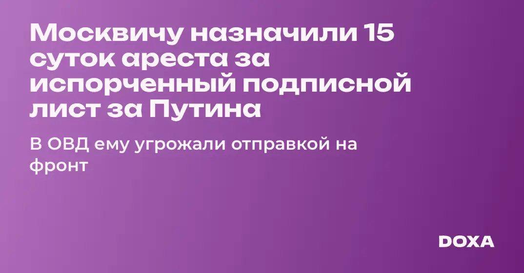 Москвичу назначили 15 суток ареста за испорченный подписной лист за Путина. В ОВД ему угрожали отправкой на фронт