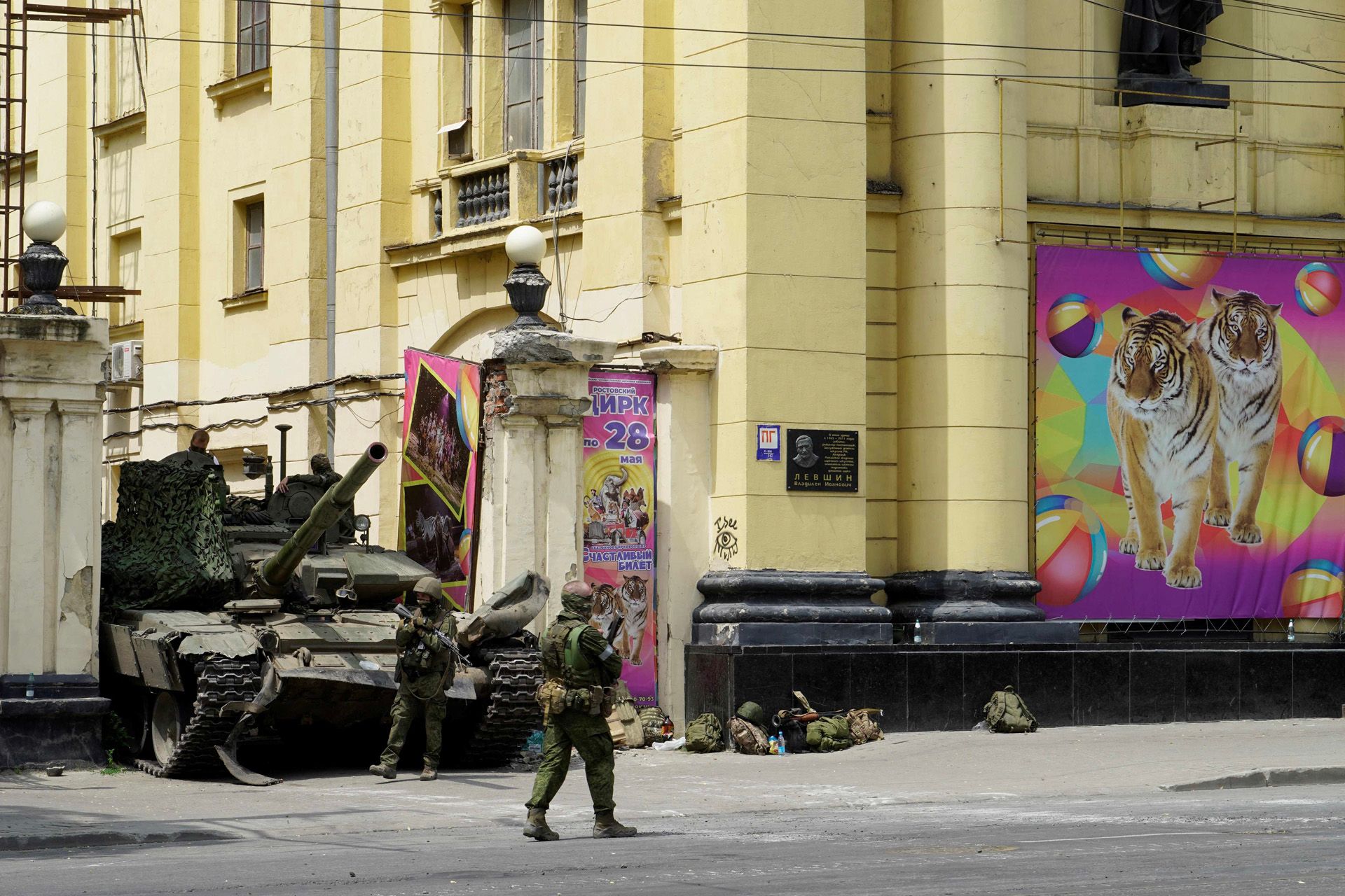 Бойцы ЧВК Вагнера у здания штаба Южного военного округа в Ростове-на-Дону. 24 июня 2023 годаAFP / Scanpix / LETA Танк ЧВК Вагнера в воротах ростовского цирка, расположенного рядом со зданием штаба Южного военного округа в Ростове-на-Дону. 24 июня 2023 годаAP / Scanpix / LETA БТР и полицейский автомобиль на одном из блокпостов на окраине Москвы. 24 июня 2023 годаАлександр Земляниченко — младший / Xinhua / ZUMA Press / Scanpix / LETA Во время мятежа Путин выступил со срочным обращением к россиянам. В нем он обвинил Пригожина (не назвав его по имени) в «предательстве» и «измене». Также Путин заявил, что все, кто участвует в попытке военного переворота, раскалывают страну и понесут за это наказание. Его обращение транслировали на уличных экранах в разных городах страны. 24 июня 2023 годаAlexander Ermochenko / Reuters / Scanpix / LETA Жители Ростова-на-Дону фотографируют Евгения Пригожина, выезжающего из города после провала мятежа. 24 июня 2023 года@grey_zone / Telegram / AFP / Scanpix / LETAnpix / LETA Место крушения самолета Пригожина в Тверской области. 23 августа 2023 года
