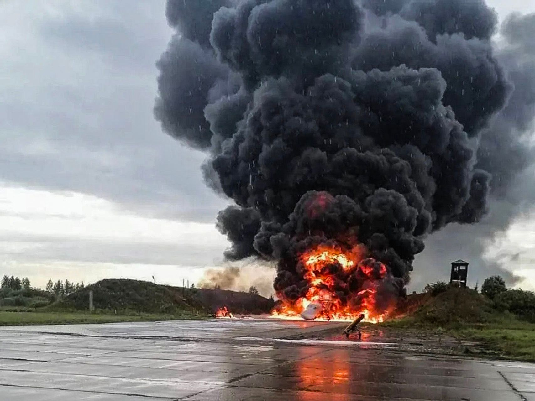 Анатолий Мальцев / EPA / Scanpix / LETA Полицейские рядом с петербургским кафе Street Food Bar № 1, где 2 апреля во время взрыва погиб «военкор» Владлен Татарский (настоящее имя — Максим Фомин). Обвиняемой по делу о теракте проходит 26-летняя Дарья Трепова. По версии следствия, она принесла в кафе и передала Татарскому гипсовую статуэтку, в которой находилась взрывчатка. Треповой грозит до 30 лет колонии общего режима. 2 апреля 2023 годаSefa Karacan / Anadolu Agency / ABACAPRESS / ddp images / Vida Press Московский Кремль после атаки двух беспилотников, произошедшей в ночь на 3 мая. Первый взорвался над куполом Сенатского дворца, второй — почти на том же месте 16 минут спустя. Российские власти заявили, что беспилотники были сбиты системой ПВО, и обвинили в атаке Киев — причем официально они сообщили об этом только в середине следующего дня. Украинские власти отрицали причастность к атаке. 3 мая 2023 годаКанал РДК в Telegram / Reuters / Scanpix / LETA Боец «Русского добровольческого корпуса», в котором, как утверждается, состоят добровольцы из России, после атаки на приграничный КПП «Грайворон» в Белгородской области. Утром 22 мая бойцы «корпуса», сотрудничающего с ГУР Украины, вошли в Грайворон и соседнее село Козинка. Российским войскам удалось вытеснить противника на территорию Украины. 23 мая 2023 годаКанал РДК в Telegram / Reuters / Scanpix / LETA Бойцы «Русского добровольческого корпуса» на погранпереходе «Грайворон». Вечером 22 мая в Белгородской области ввели режим контртеррористической операции — почти сутки спустя его отменили, заявив, что проникшие в регион диверсанты «заблокированы и разгромлены». По данным губернатора Вячеслава Гладкова, во время нападения были ранены 12 мирных жителей, двое погибли. 23 мая 2023 годаReuters / Scanpix / LETA Вагоны, сошедшие с рельсов на участке Симферополь — Севастополь на территории аннексированного Крыма. Утром 18 мая на железной дороге рядом с Бахчисараем (по другим данным — недалеко от села Чистенькое) произошел взрыв, повредивший около 50 метров железнодорожного полотна. С рельсов сошли восемь вагонов с зерном, пять из них перевернулись. О пострадавших не сообщалось. 18 мая 2023 годаReuters / Scanpix / LETA На полигоне в Кировском районе аннексированного Крыма в ночь на 19 июля начался пожар. Назначенный Кремлем глава Крыма Сергей Аксенов не назвал причины возгорания. В тот день власти эвакуировали жителей четырех населенных пунктов, расположенных рядом с полигоном, — более двух тысяч человек. 19 июля 2023 годаАлександр Неменов / AFP / Scanpix / LETA Здание «Око-2» в деловом центре Москва-Сити, поврежденное беспилотником. В ночь на 30 июля два дрона врезались в здания «IQ-квартал» и «Око-2» — взрывом выбило окна на нескольких этажах обеих башен. Официально власти не сообщали о пострадавших, однако в экстренных службах заявили, что в «Око-2» был ранен охранник. По словам мэра Сергея Собянина, дроны были украинскими. В Кремле об этом ничего не говорили. В офисе президента Украины не подтверждали причастность к нападению. 30 июля 2023 годаUkraine Weapons Tracker / Twitter Пожар на военном аэродроме в Новгородской области. 19 августа беспилотник атаковал аэродром, повредив один борт. Никто не пострадал. На следующий день издание «Сирена» опубликовало снимки читателя, на которых видно горящий российский сверхзвуковой стратегический бомбардировщик Ту-22М3 (известно, что такие базировались на аэродроме Сольцы под Великим Новгоро
