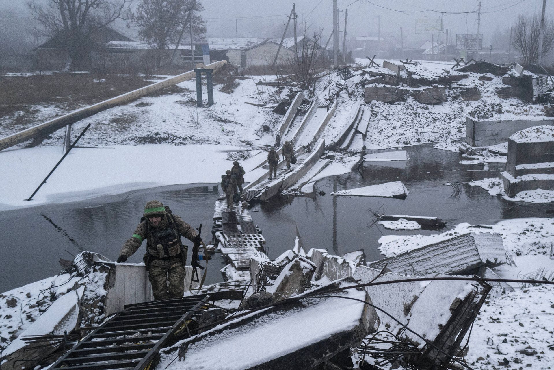 Wolfgang Schwan / Anadolu Agency / ABACAPRESS / ddp images / Vida Press Мина в поле под Лиманом — важным узлом примерно в 100 километрах к северу от оккупированного Донецка. В конце мая 2022 года войска РФ захватили Лиман — ВСУ вернули его под свой контроль 1 октября того же года. 27 февраля 2023 годаEvgeniy Maloletka / AP / Scanpix / LETA Боец ВСУ, укрывающийся от обстрела возле горящего дома во время атаки на Авдеевку 17 марта. В тот день российские войска нанесли по Авдеевке четыре авиаудара. Впервые были использованы авиабомбы с модулем планирования и коррекции по спутниковому сигналу (УМПК). Обошлось без жертв. 17 марта 2023 годаLibkos / AP / Scanpix / LETA Украинские военные и волонтеры эвакуируют лошадей с заброшенной фермы в Авдеевке. 25 апреля 2023 годаLibkos / AP / Scanpix / LETA Раненый украинский военный ожидает эвакуации с позиций ВСУ под Бахмутом. Украинское контрнаступление на Бахмут не увенчалось успехом. 4 сентября 2023 годаKostya Liberov / Libkos / Getty Images Бойцы спецподразделения ВСУ под командованием военнослужащего с позывным «Курт» обстреливают российские позиции под Бахмутом из РПГ. 3 ноября 2023 годаСтанислав Красильников / Спутник / IMAGO / SNA / Scanpix / LETA Российские военные ведут огонь из гаубицы 2А65 «Мста-Б» по украинским позициям на лиманском направлении. 18 ноября 2023 годаAndre Alves / Anadolu / ddp / Vida Press Бойцы 58-й механизированной бригады ВСУ в бронетранспортере M113 на позициях под Угледаром — городе в 50 километрах к юго-западу от оккупированного Донецка. Бои за Угледар продолжаются с марта 2022 года, он остается под контролем Украины. В начале ноября российские войска попытались захватить Угледар, но понесли тяжелые потери.Libkos / AP / Scanpix / LETA Вид на разрушенную Марьинку — город на окраине Донецка. 11 мая 2023 года. Руины города были окончательно захвачены ВС РФ только в конце декабря