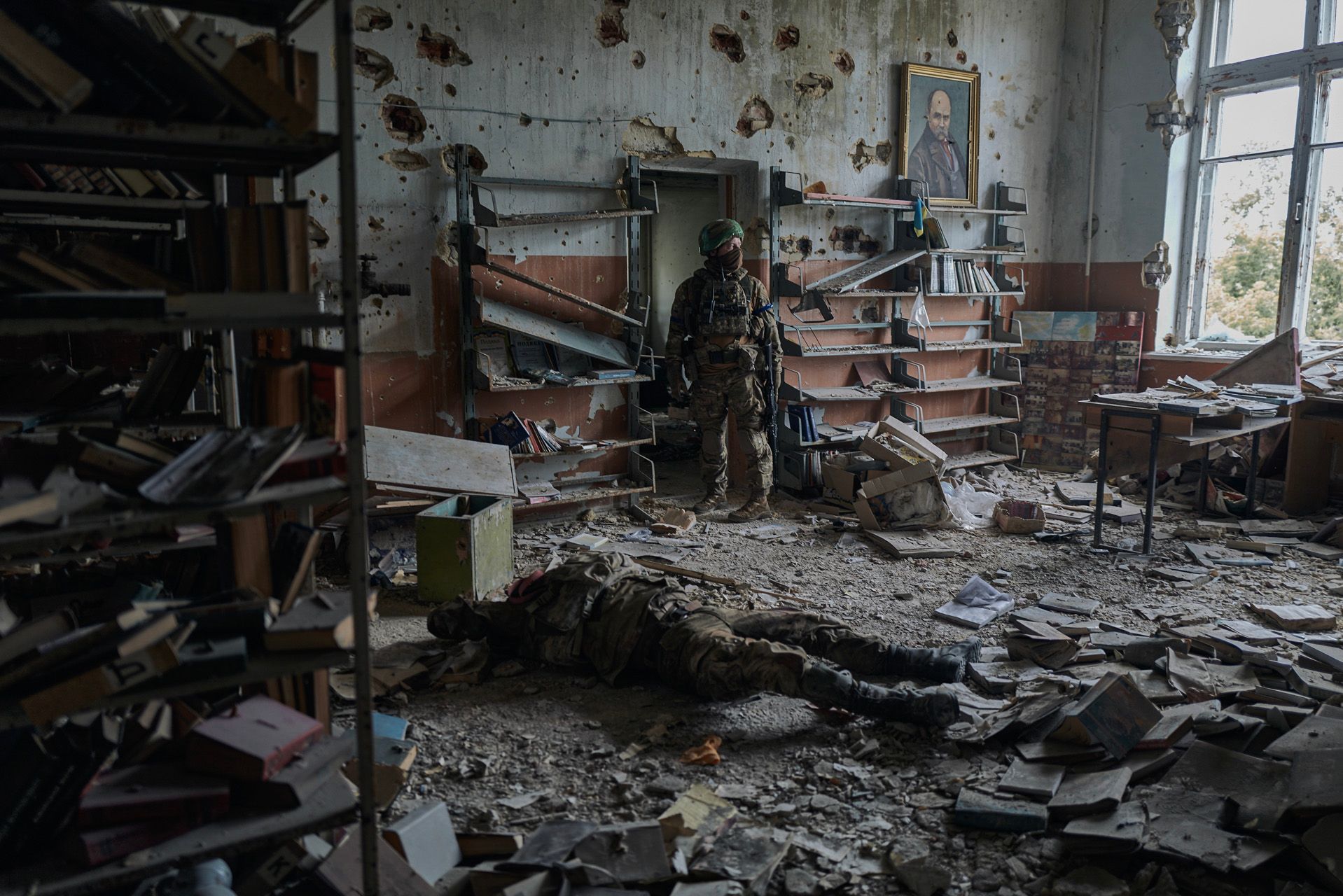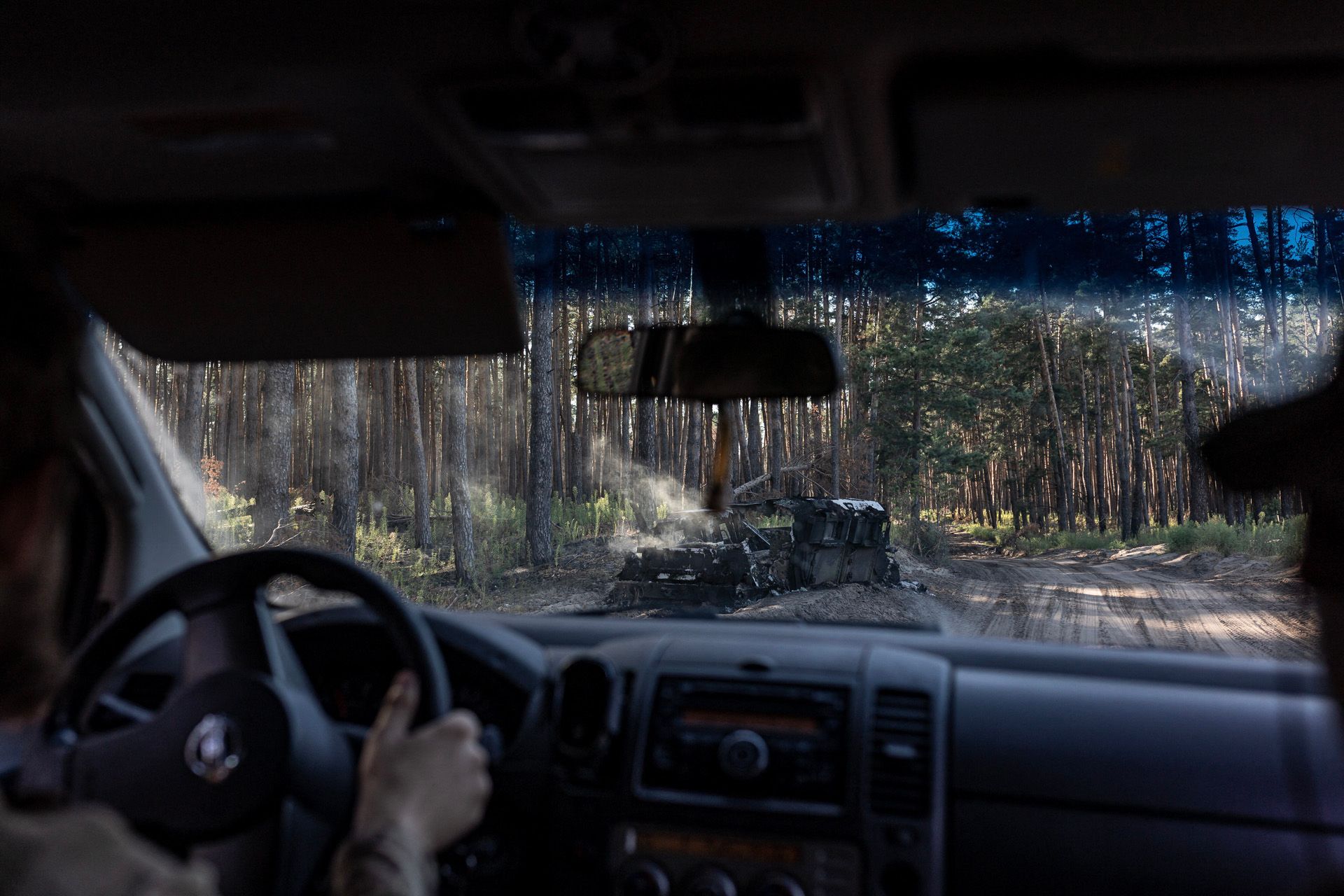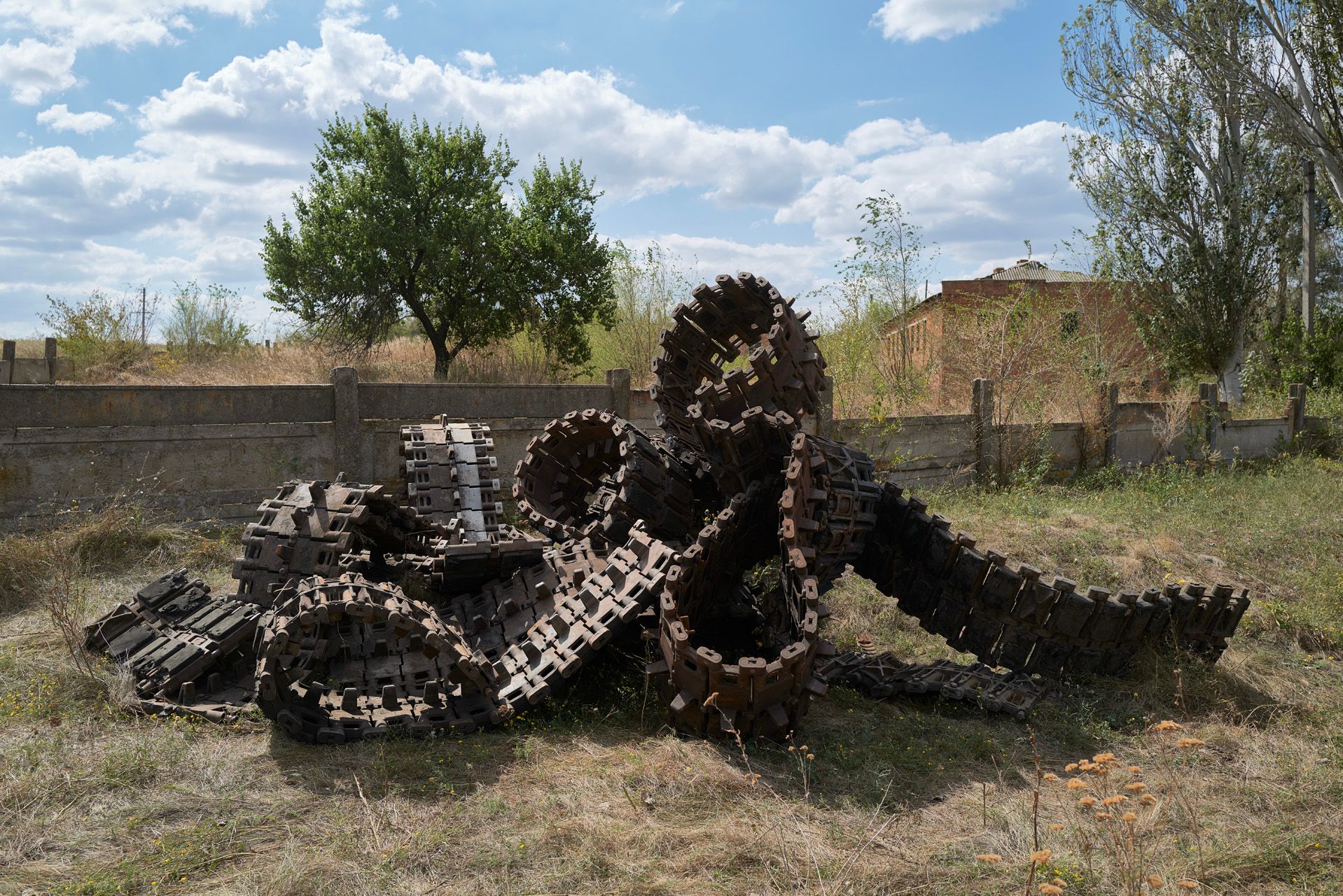 Wojciech Grzedzinski / Anadolu Agency/ABACAPRESS/ddp images / Vida Press Дым возле Нью-Йорка — поселка в Донецкой области. До войны в нем жили почти десять тысяч человек, сейчас осталось около тысячи жителей. Населенный пункт находится меньше чем в километре от линии фронта под постоянным обстрелом российских войск. 9 августа 2023 годаOleksandr Ratushniak / Reuters / Scanpix / LETA Украинский военный в селе Нескучное Донецкой области, освобожденном ВСУ в начале большого контрнаступления в середине июня. 13 июня 2023 годаWojciech Grzedzinski / The Washington Post / Getty Images Кадр из серии польского фотографа Войцеха Гжедзинского, сделанной им из армейского автомобиля «Хамви», который украинским войскам передали США. Фотограф проехал по улицам прифронтового города Орехова и села Новоданиловка Запорожской области и запечатлел разрушения, оставшиеся после боев и обстрелов. 14 сентября 2023 годаLibkos / AP / Scanpix / LETA Тело убитого российского солдата в Доме культуры села Благодатное Донецкой области, освобожденного, как и Нескучное, в середине июня. 16 июня 2023 годаРоссийские вертолеты Ка-52 «Аллигатор» в Запорожской области. Ка-52, вооруженные противотанковыми ракетами «Вихрь», стали одним из основных средств отражения украинского контрнаступления. 26 июня 2023 годаDiego Herrera Carcedo / Anadolu Agency / ABACAPRESS / ddp images / Vida Press Украинские военные едут мимо сгоревшей военной техники в направлении села Торское, расположенного в 22 километрах от Краматорска. Армия РФ заняла Торское в июле 2023 года, ВСУ вернули контроль над ним в октябре 2022 года. 15 августа 2023 годаPierre Crom / Getty Images Гусеница танка во дворе жилого дома в Запорожской области. 7 сентября 2023 годаLibkos / AP / Scanpix / LETA Украинский солдат с позывным «Молот» в окопе на передовой в Запорожской области. «Молот» потерял ногу в бою, но вернулся на фронт с протезом. 1 июля 2023 года