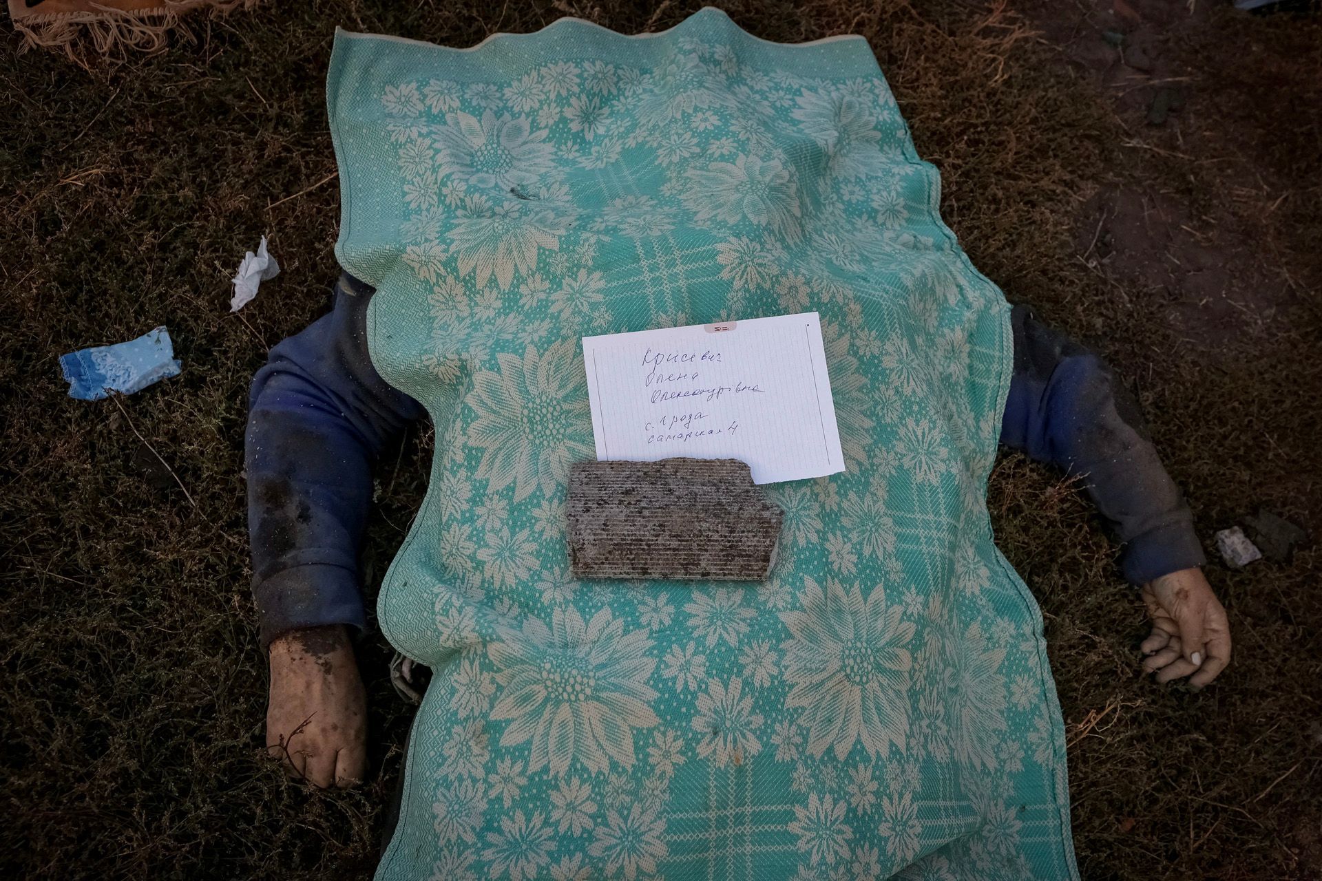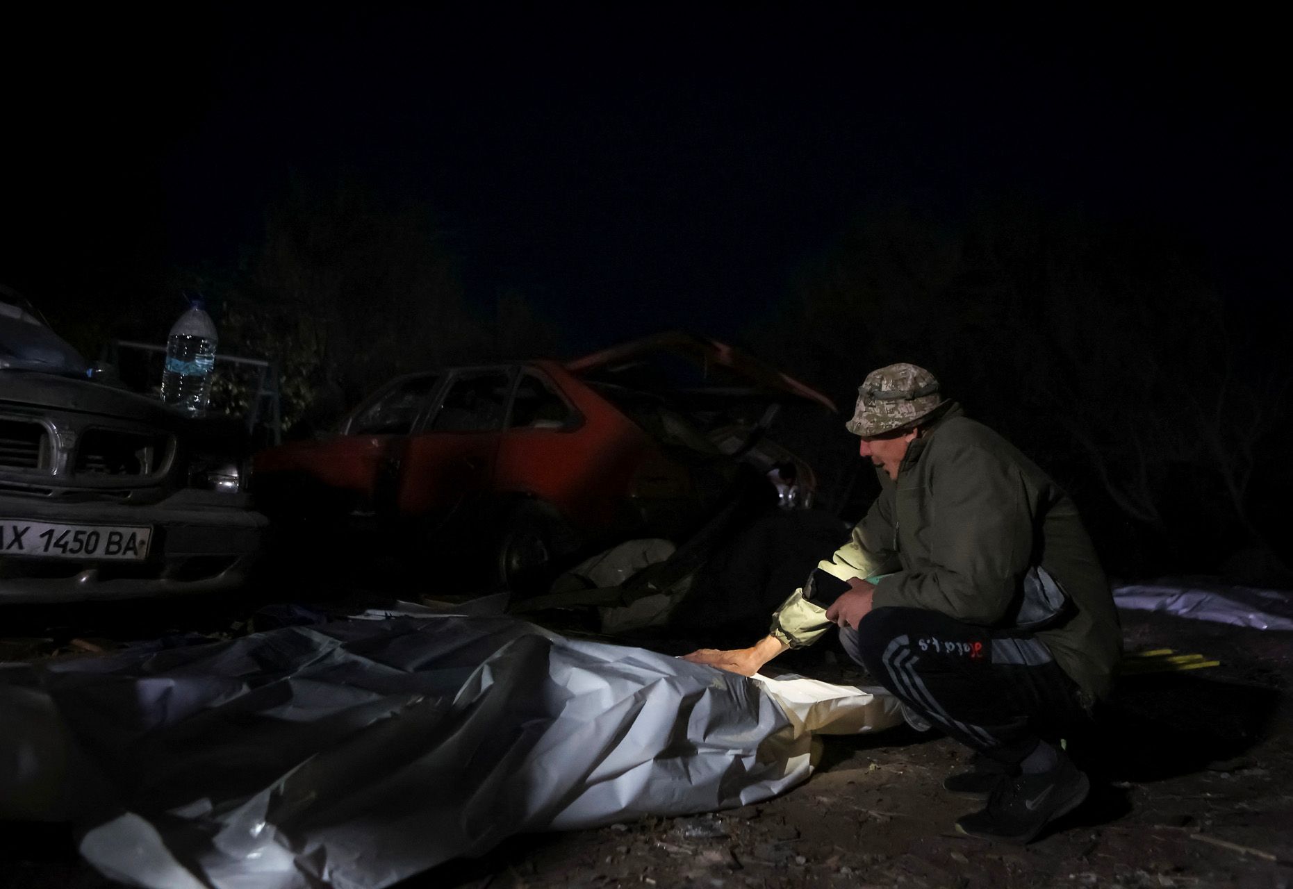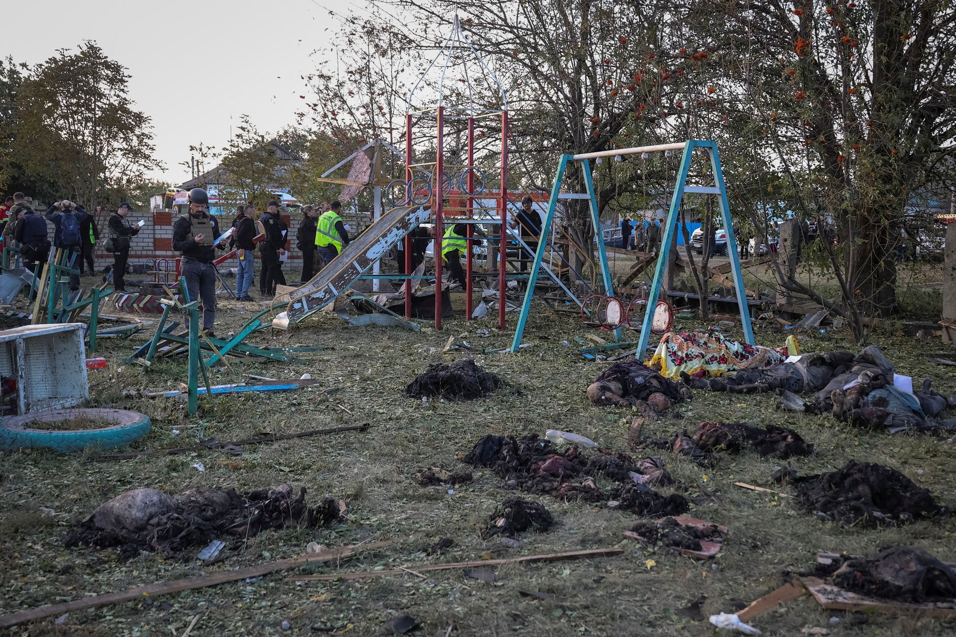 Vyacheslav Madiyevskyy / Reuters / Scanpix / LETA Тела погибших жителей Грозы на детской площадке возле сельского кафе. 5 октября 2023 годаSofiia Gatilova / Reuters / Scanpix / LETA Тело погибшей жительницы Грозы. На записке — ее имя. 5 октября 2023 годаSofiia Gatilova / Reuters / Scanpix / LETA Житель Грозы плачет у тела погибшего родственника. 5 октября 2023 годаYakiv Lyashenko / EPA / Scanpix / LETA Вид на кладбище в селе Гроза с временными ограждениями для будущих могил. На переднем плане — табличка с участком для захоронения четырех человек из семьи Пантелеевых, погибших в результате ракетного удара. 6 октября 2023 года