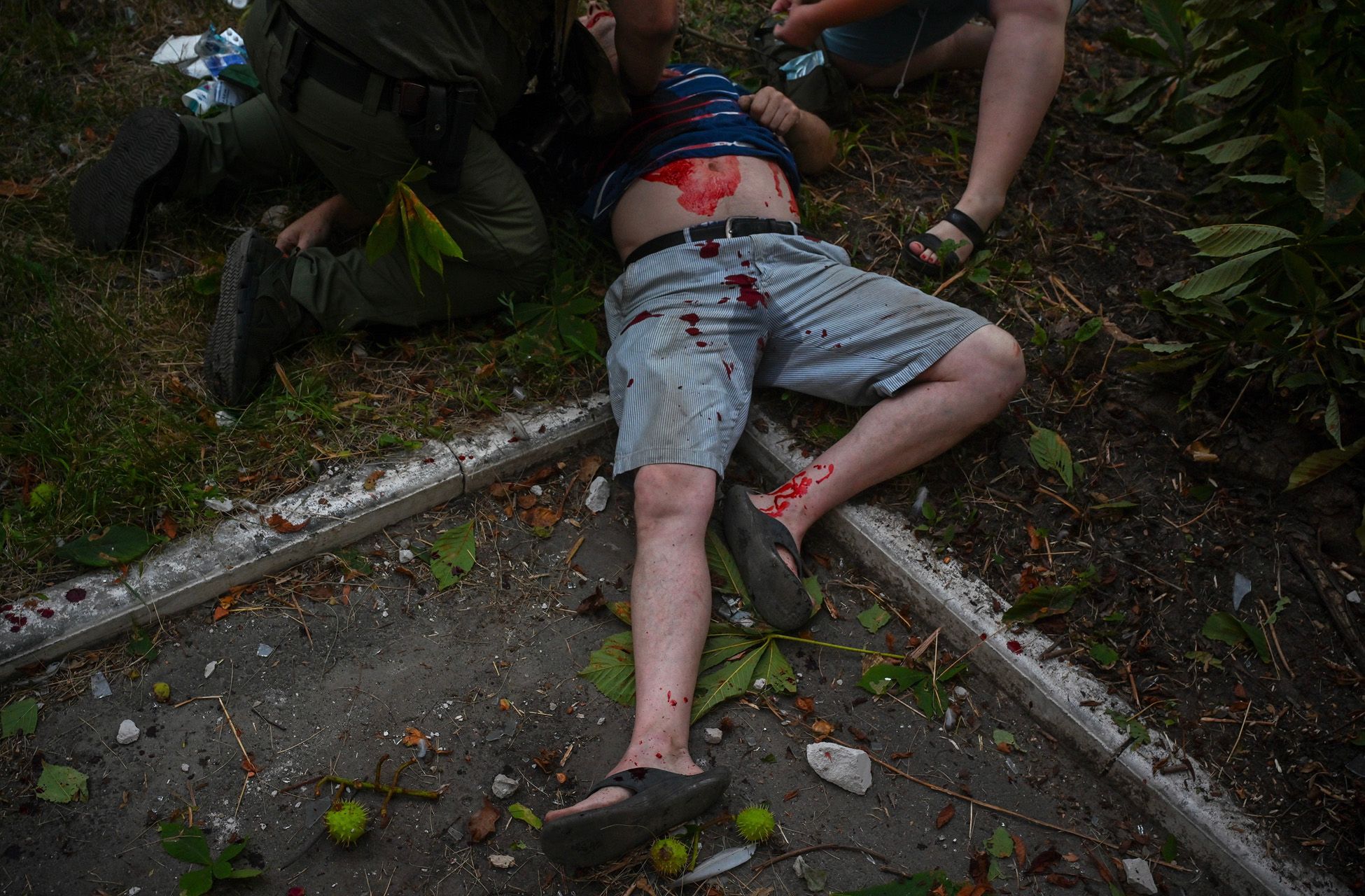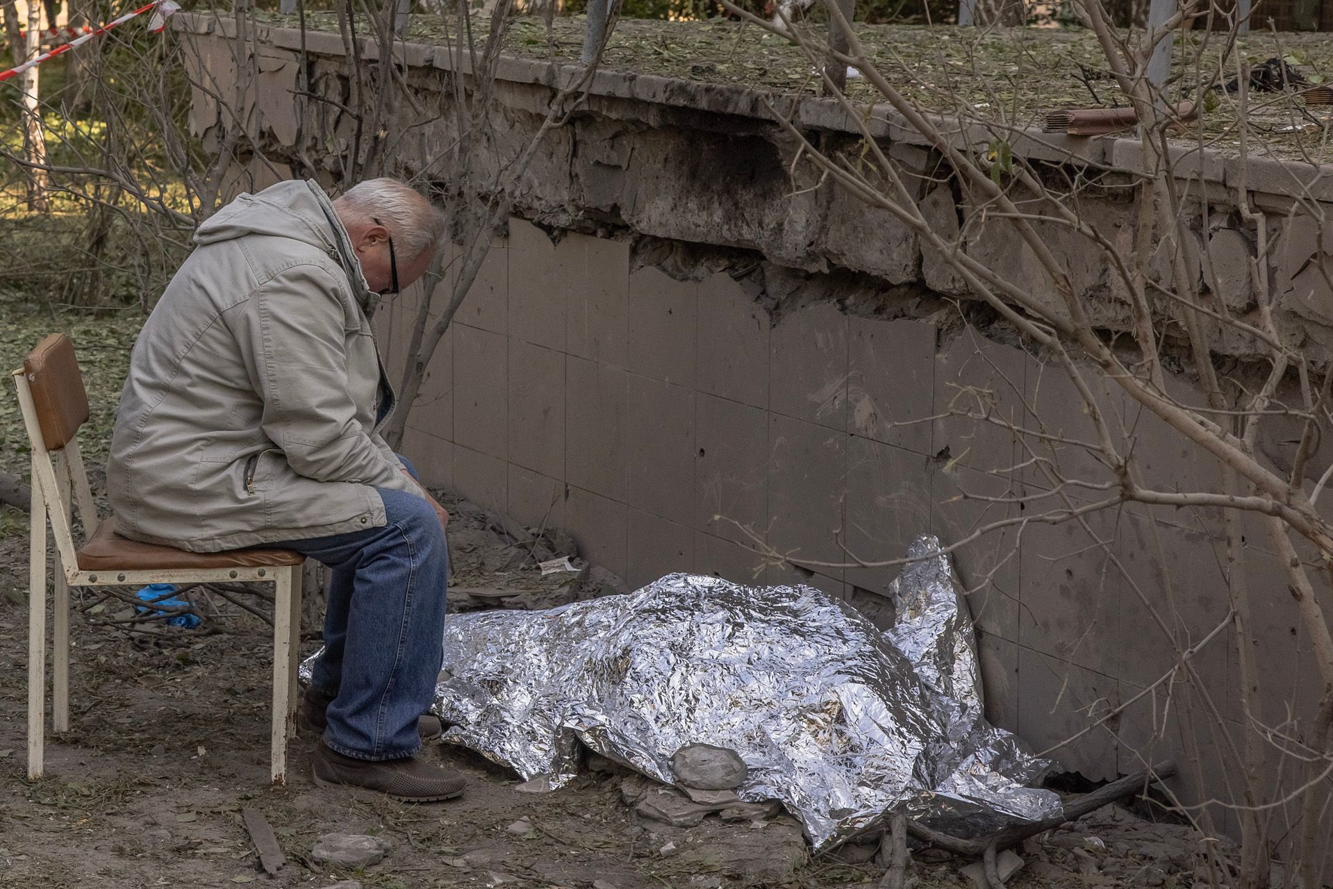 Wojciech Grzedzinski / Anadolu Agency / ABACAPRESS / ddp images / Vida Press Спасатель смотрит на жительницу Краматорска, находящуюся под завалами после российского обстрела 27 июня. В тот день ракеты попали в пиццерию в центре города и частный сектор, убив 12 мирных жителей и ранив более 60. 27 июня 2023 годаPablo Petrov / Пресс-служба ГСЧС Украины / Reuters / Scanpix / LETA Раненый киевлянин на улице возле своего дома, на который упали обломки сбитого российского беспилотника. Одна из многочисленных атак дронов РФ на украинскую столицу произошла 30 мая. Тогда погиб один мирный житель, еще 13 человек пострадали. 30 мая 2023 годаRoman Pilipey / Getty Images Родственники скорбят возле тела погибшей после очередного обстрела Киева. По данным украинских властей, в ночь на 1 июня погибли как минимум три человека, включая девочку и ее мать. Не менее десяти мирных жителей были ранены. 1 июня 2023 годаLibkos / AP / Scanpix / LETA Разрушенная алтарная преграда в Спасо-Преображенском соборе Одессы после обстрела 23 июля. В тот день помимо крупнейшего православного храма города были повреждены 43 здания, в том числе 29 памятников культурного наследия. Пострадал 21 человек, двое мирных жителей погибли. 23 июля 2023 годаStaniskav Krupar / EPA / Scanpix / LETA Спасатель оказывает первую помощь тяжелораненому жителю Покровска в Донецкой области после обстрела города 7 августа. Удары пришлись в том числе по жилым домам в центре Покровска. Погибли десять мирных жителей, более 80 человек пострадали. 7 августа 2023 года