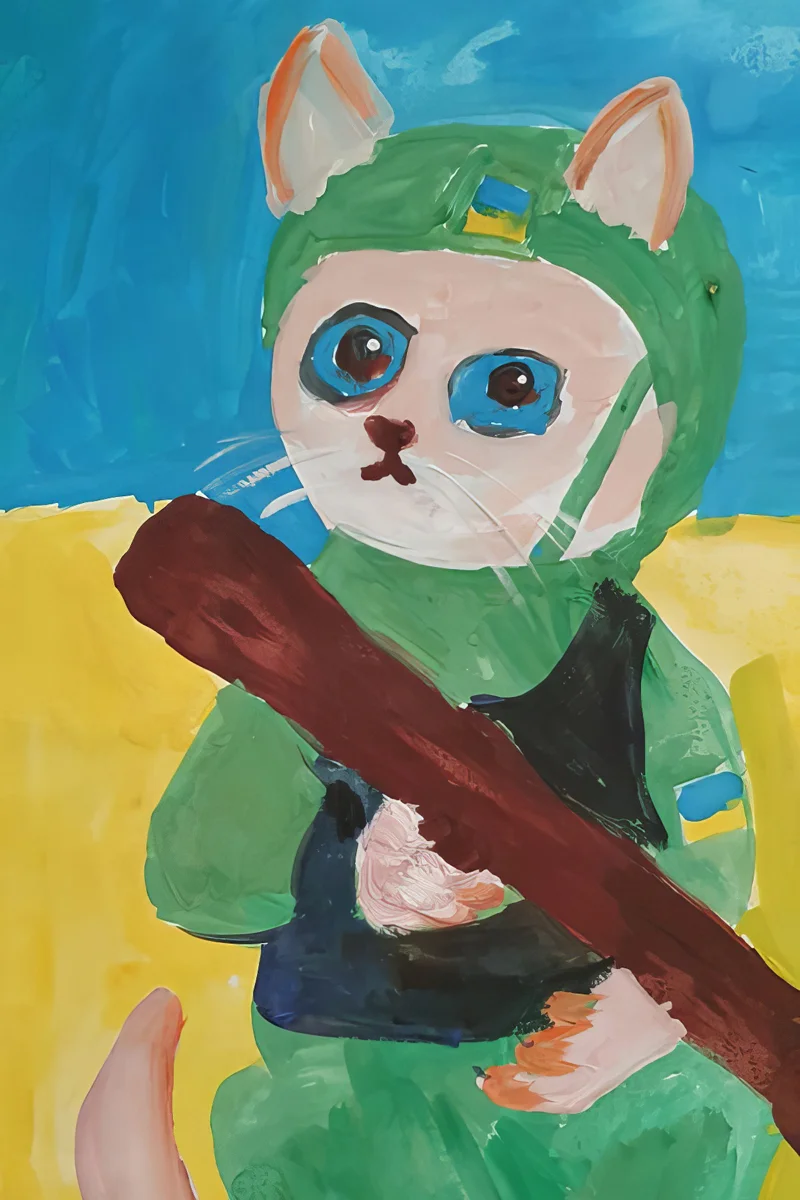 С тех пор как он создал ассоциацию, Йенс ездит в Украину каждый месяц. Теперь редко на мотоцикле, чаще — на фургоне, груженом экипировкой, огнетушителями и «медициной». Первый такой фургон он разгрузил прямо под Бахмутом, где находилась уже знакомая ему бригада. «И получил вот такой подарок! — Йенс показывает мне детский рисунок. На нём кот с большими голубыми глазами в украинской солдатской униформе и с автоматом. — Это Андрей нарисовал, ему семь лет. Сын моего близкого друга, который воюет в той бригаде».