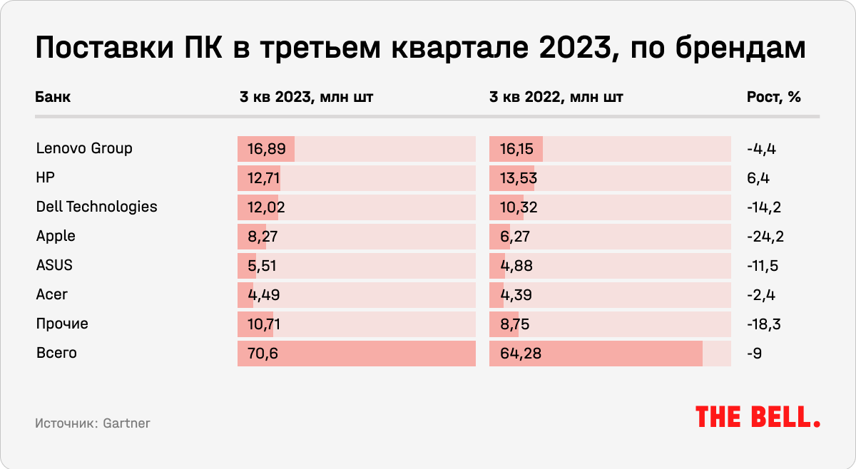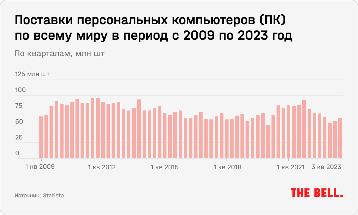 Некоторые эксперты ждали, что удаленный и гибридный режимы работы, а также развитие онлайн-образования поддержат высокий спрос на устройства и дальше. Но после ажиотажного спроса на устройства в пандемию в 2022 году рынок резко упал. По данным Gartner, мировые поставки ПК тогда обвалились на 16,2% год к году, до 286,2 млн единиц. Тенденция сохранилась и в 2023 году. По итогам третьего квартала мировые поставки ПК составили 64,3 млн единиц, на 9% меньше год к году.