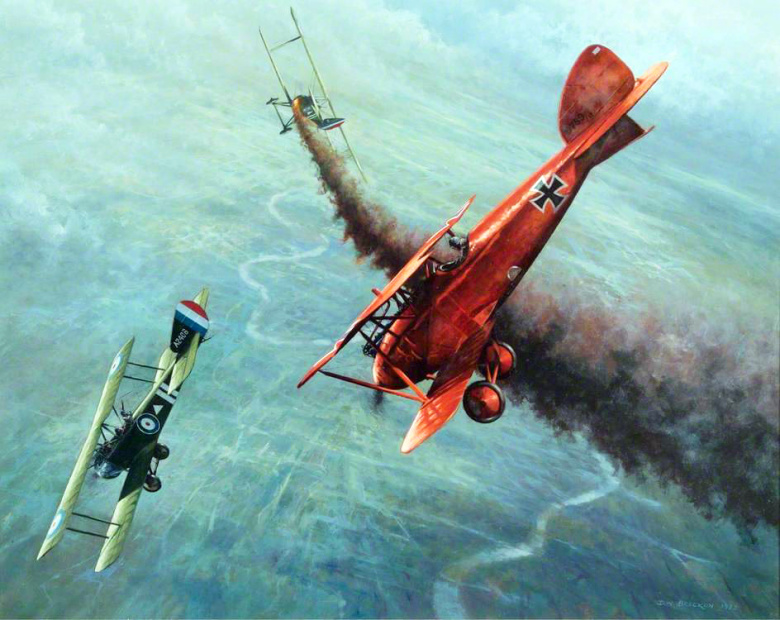 «Красный барон» Манфред фон Рихтгофен и его Albatros D. V. (на первом плане) в воздушном бою с французскими истребителями (1917)