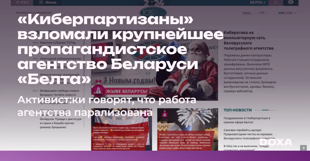 Беларуская хакактивистская группа «Киберпартизаны» взломала компьютерную сеть и сайт «Белорусского телеграфного агенства» (БЕЛТА), крупнейшего пропагандистского ресурса в республике. По информации активисто:к, сейчас работа в БЕЛТА парализована.