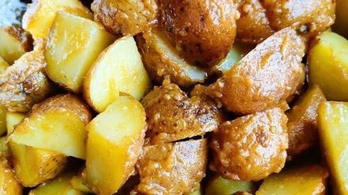 - Выкладываем на противень (лучше на антипригарный коврик) и запекаем около 40 минут, периодически поворачивая противень и помешивая картошку.