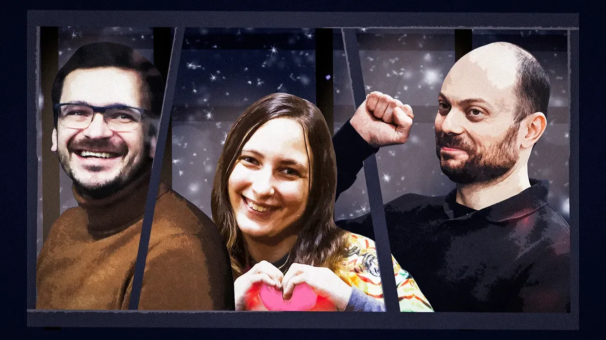 Политзеки 2023 года — Саша Скочиленко, Илья Яшин и Владимир Кара-Мурза — поздравляют читателей «Новой газеты Европа» с наступающим 2024-м.