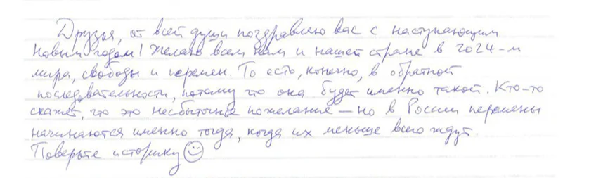 «Друзья! От всей души поздравляю вас с наступающим Новым годом! Желаю всем нам и нашей стране в 2024 году мира, свободы и перемен. То есть, конечно, в обратной последовательности, потому что она будет именно такой. Кто-то скажет, что это несбыточное пожелание, но в России перемены начинаются именно тогда, когда их меньше всего ждут. Поверьте историку.