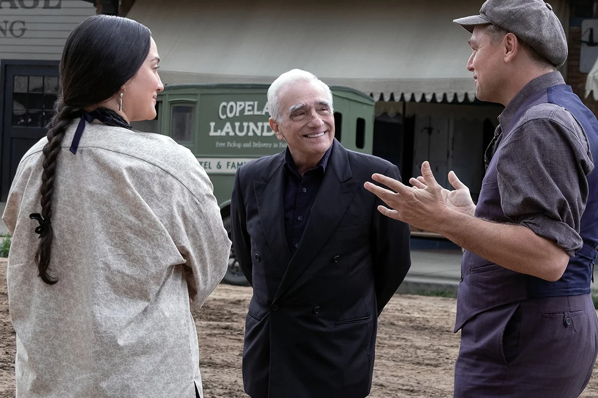 Леонардо Ди Каприо, Мартин Скорсезе и Лили Глэдстоун на съемочной площаке фильме "Убийцы цветочной луны" (2023). Фото: IMDB