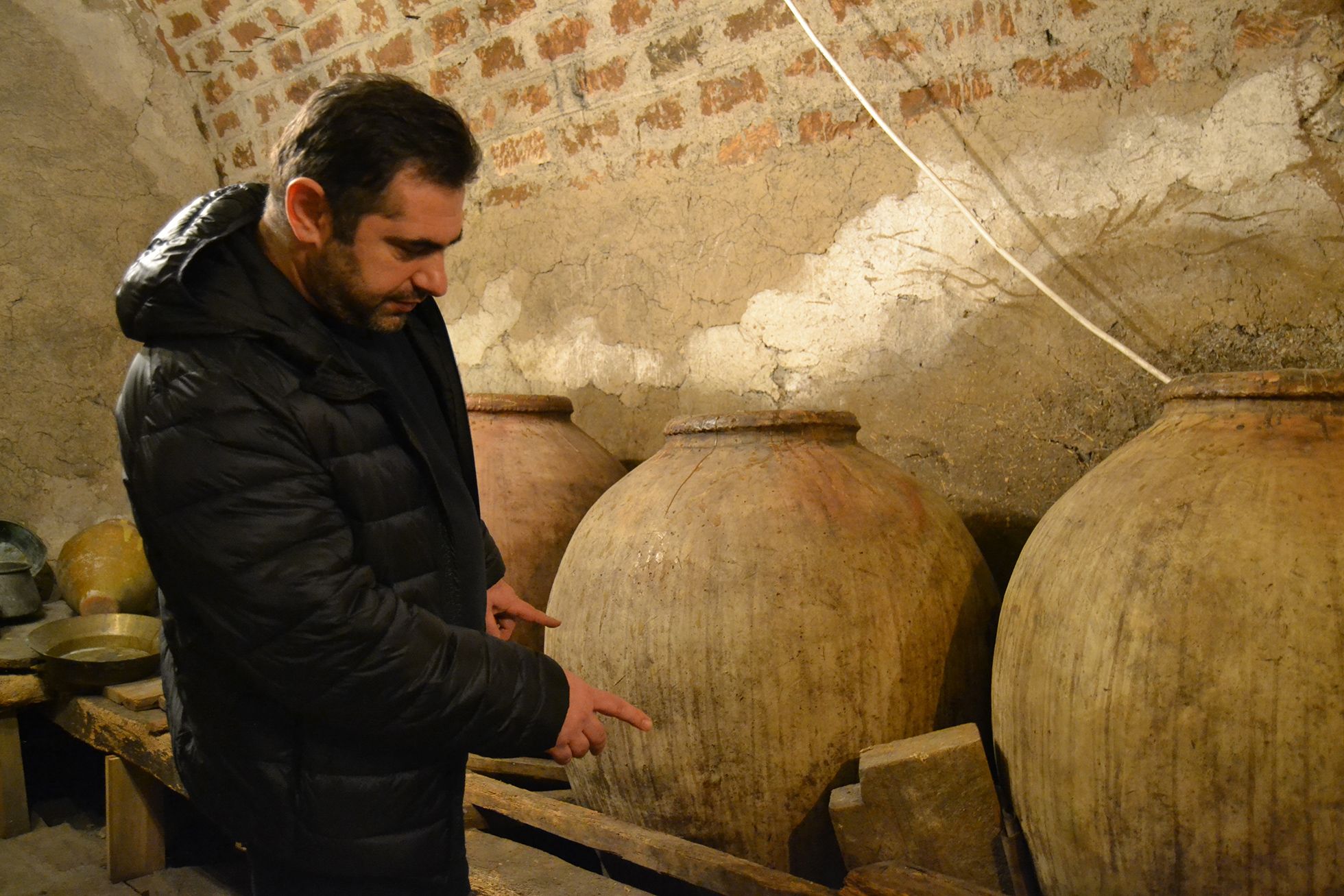 Artsrun Petrosyan, the Norqi Keghar Winery’s co-founder, smiled as he displayed the 150-year-old winepress. “Only men crushed the grapes in the winepress. Women weren’t allowed to come close to that work,” he explained, adding that this was a family tradition. He then proceeded to the room where the vats inherited from Hovhannes Derdzakyan are still used to age wine today. Petrosyan covers them with beeswax, giving the wine a mild taste.