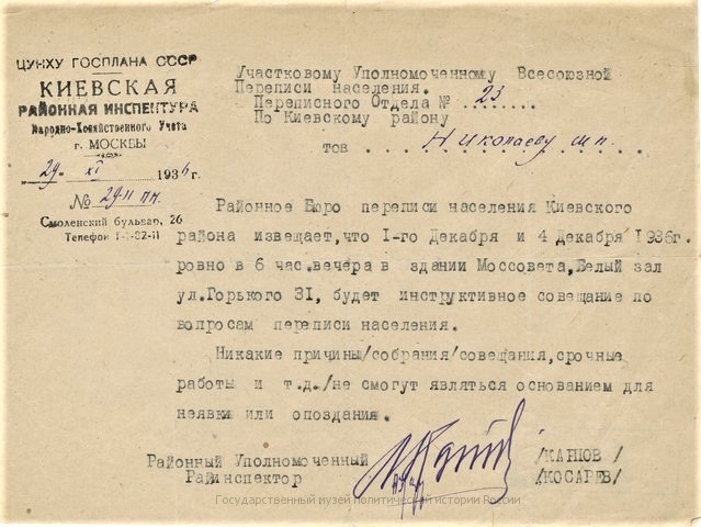 Из отчета о совещании районных уполномоченных-инспекторов Нархозучета, проходившем в Мособлисполкоме 3–15 октября 1936 года"Громом аплодисментов было встречено сообщение начальника ЦУНХУ т.И.А.Краваля о том, что переписной лист краткий, ясный и глубокосодержательный с первого до последнего вопроса был написан лично товарищем Сталиным".