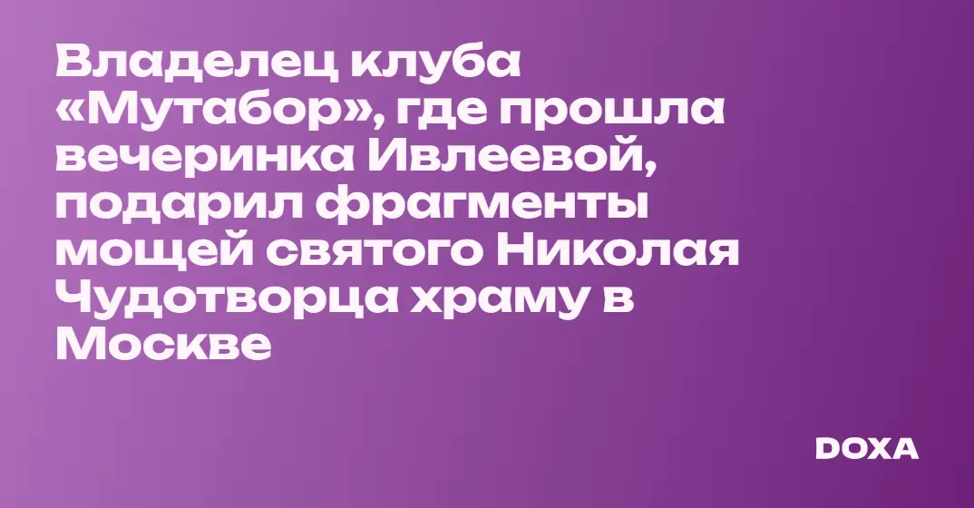Михаил Данилов, владелец московского клуба «Мутабор», в котором прошла «почти голая» вечеринка Ивлеевой подарил фрагменты мощей святого Николая Чудотворца храму Знамения иконы Божией Матери, сообщает связанный с силовиками телеграм-канал Mash. По его словам, мощи были куплены лично им в Ватикане еще в ноябре. Он ждал января, чтобы подарить их церкви.
