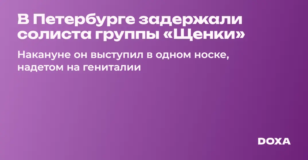 В аэропорту Пулково задержан солиста группы «Щенки» Максим Моисеев. Недавно во время концерта он выступил в одном носке, надетом на гениталии. По данным связанного с силовиками телеграм-канала Mash, на исполнителя составлен протокол по статье о «мелком хулиганстве».
