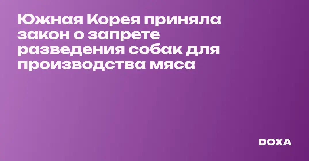 Парламент Южной Кореи принял законопроект, запрещающий разведение собак на убой и продажу собачьего мяса. За введение запрете проголосовали 208 депутато:к, еще дв:е воздержались от голосования. Общественные опросы показали, что 56% житель:ниц страны поддерживают подобные запреты.