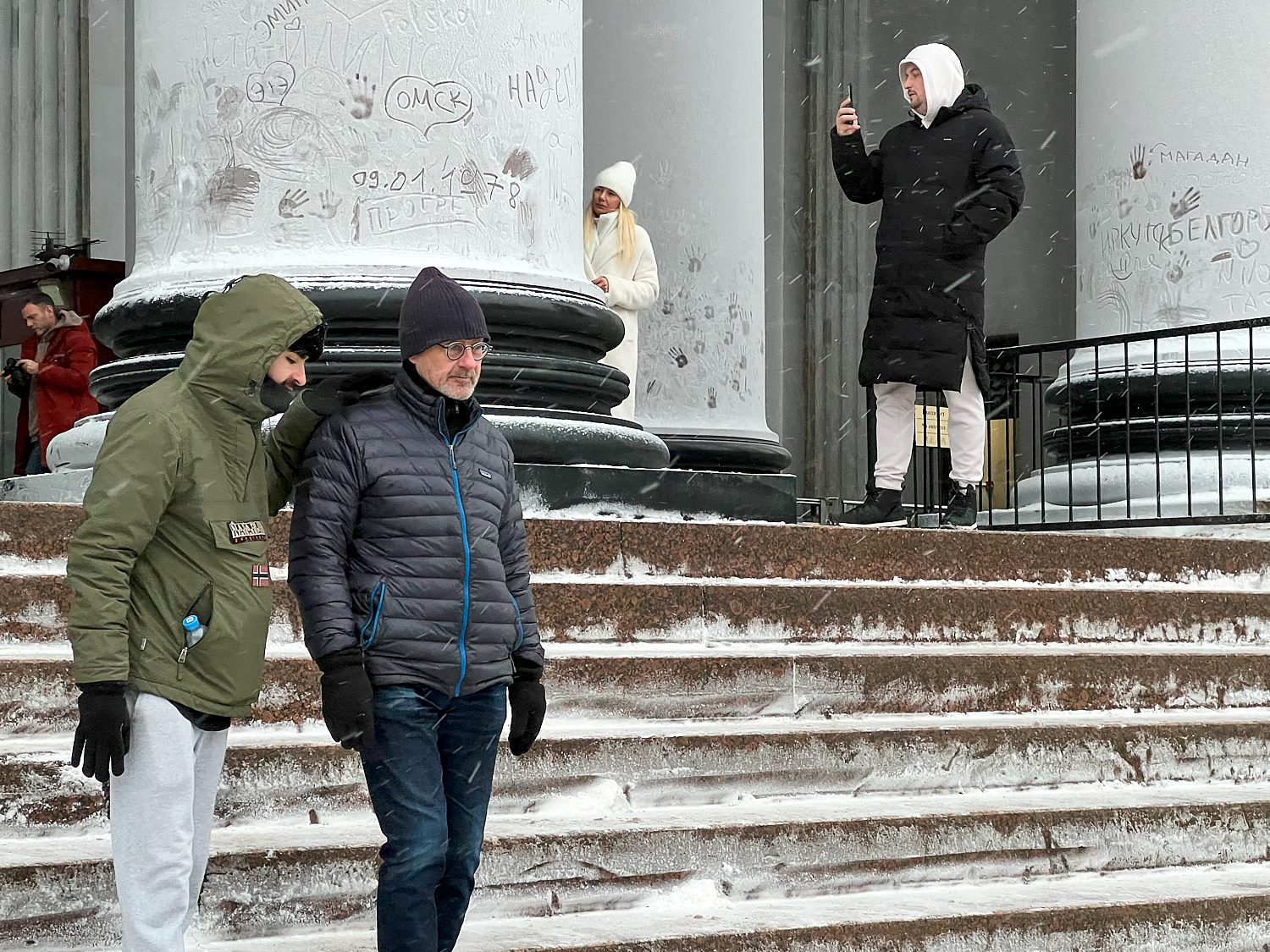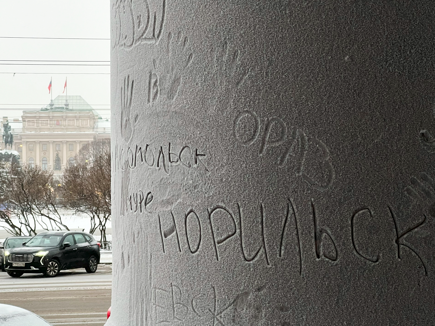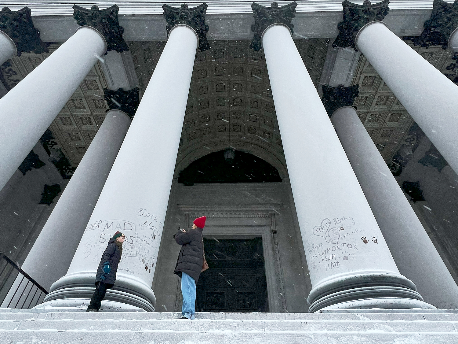 Здания и памятники Петербурга покрылись инеем, а горожане начали оставлять на нем рисунки и надписи. На Исаакиевском соборе пишут даты, названия городов и имена, а также рисуют сердца и оставляют следы ладоней.