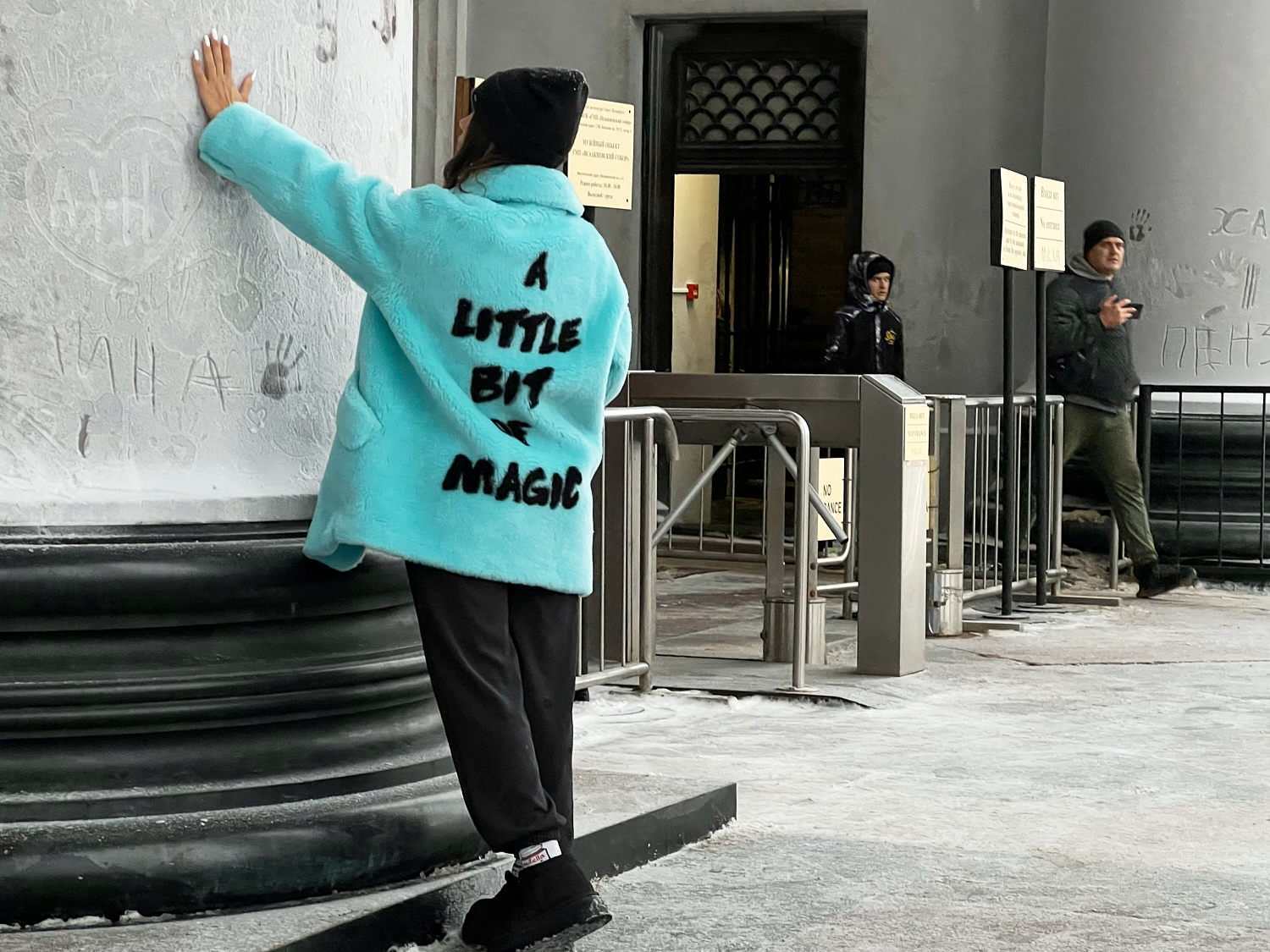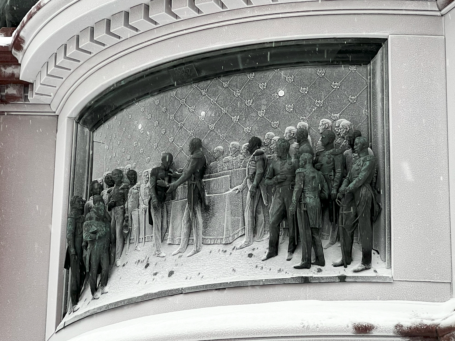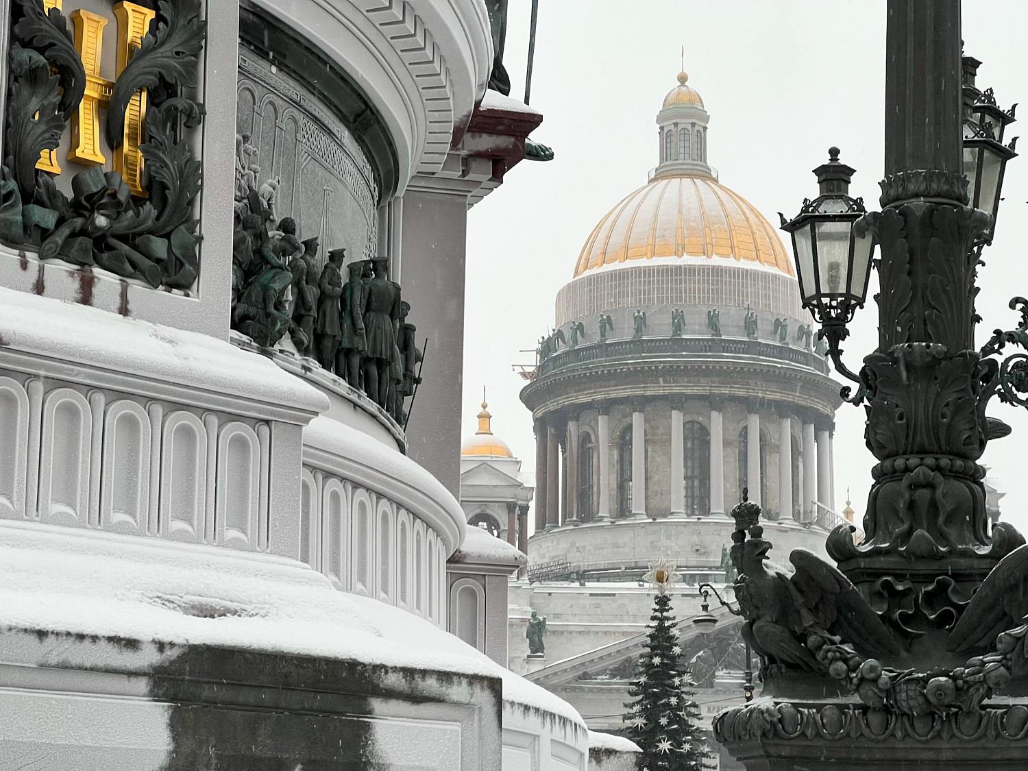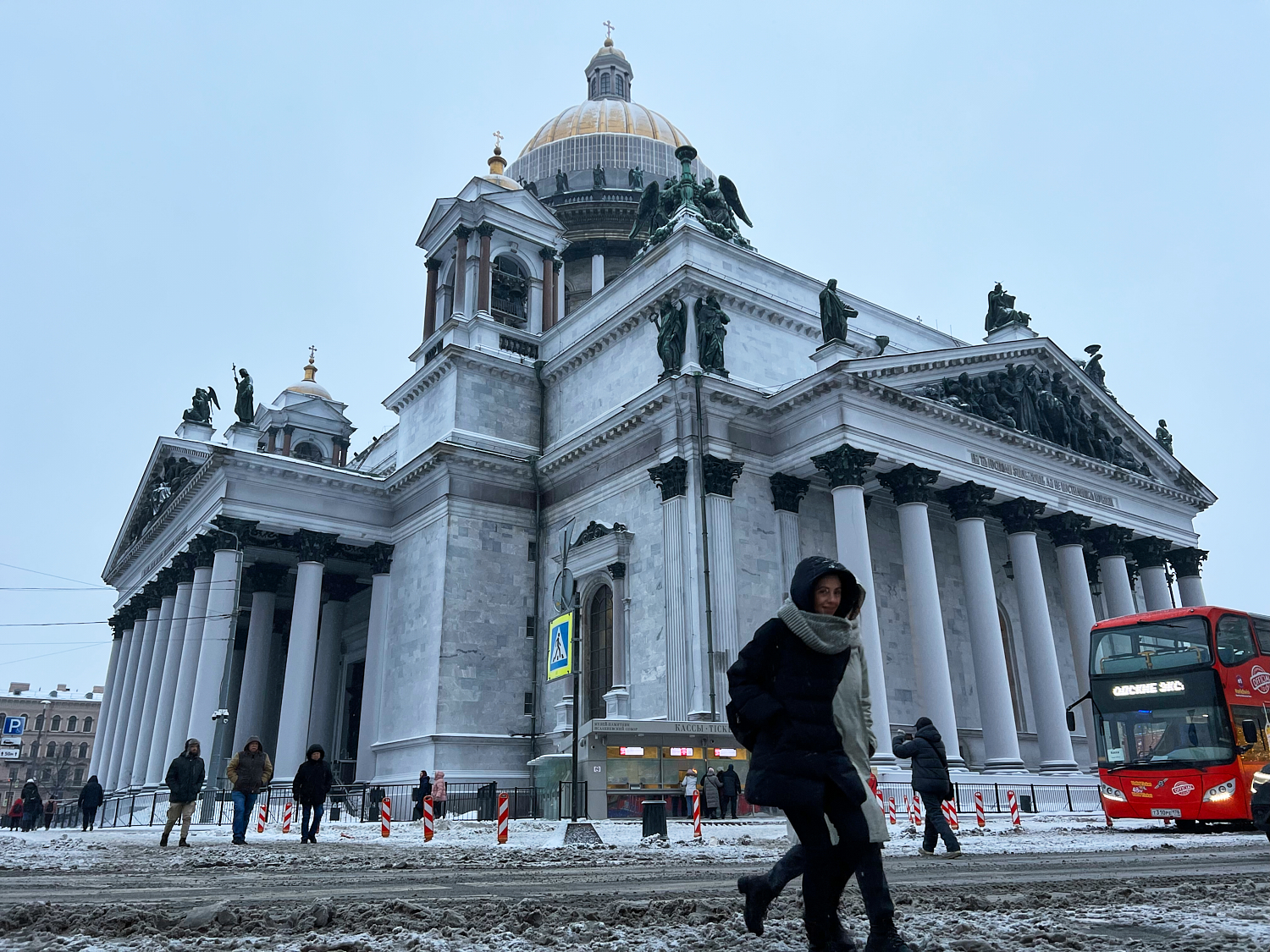 Здания и памятники Петербурга покрылись инеем, а горожане начали оставлять на нем рисунки и надписи. На Исаакиевском соборе пишут даты, названия городов и имена, а также рисуют сердца и оставляют следы ладоней.