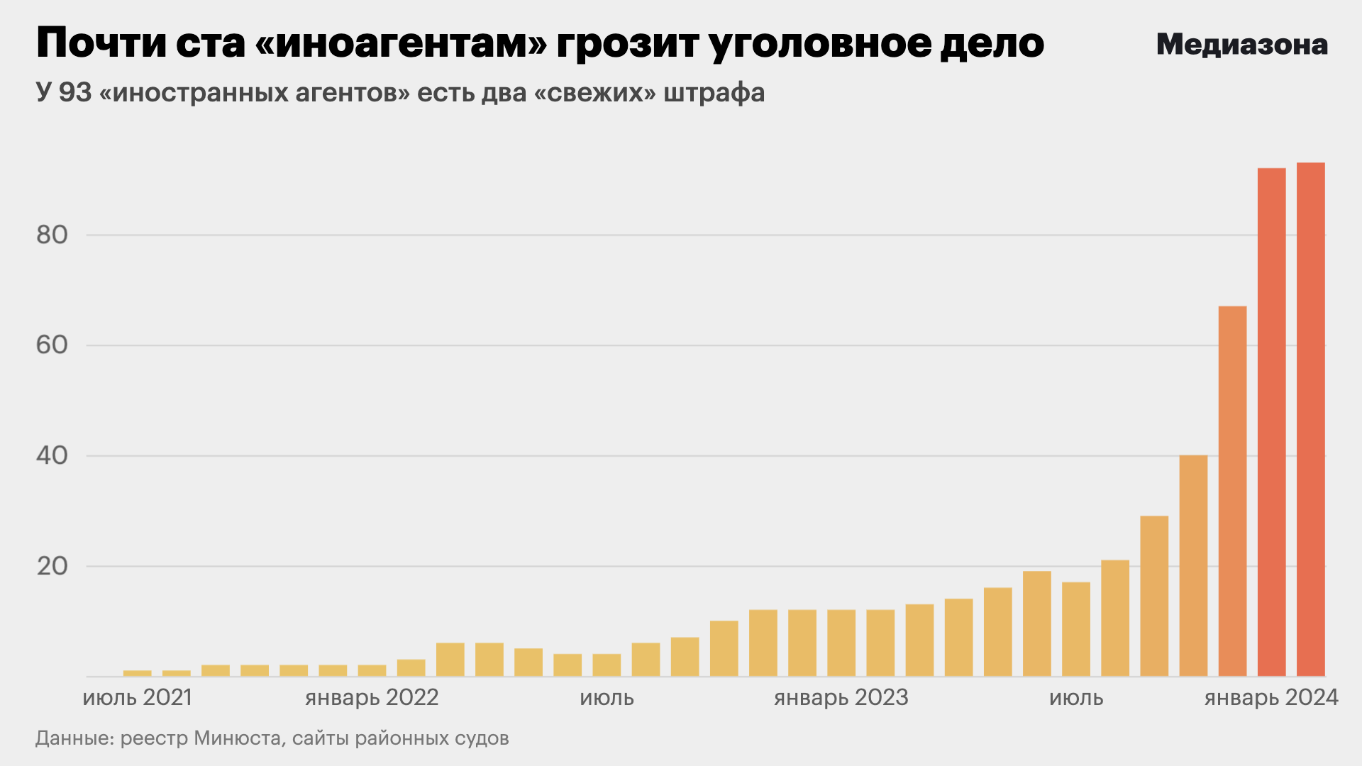 «Медиазона» изучила все опубликованные судами данные и посчитала количество людей, у которых в течение года было минимум два штрафа по «иноагентским» протоколам. Сейчас преследование по части 2 статьи 330.1 УК грозит 93 «иностранным агентам».