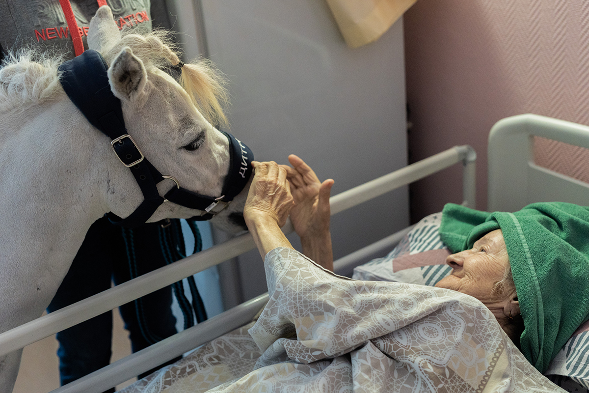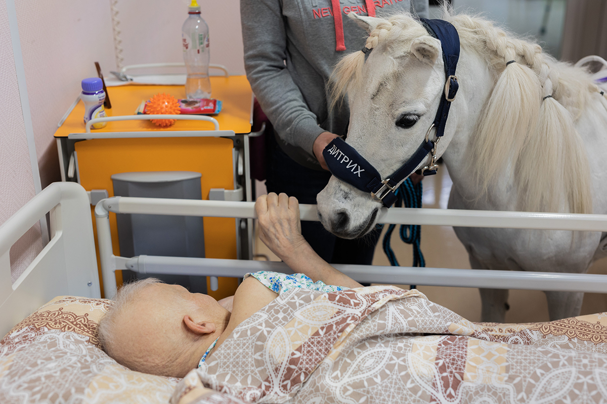 Во многих российских хосписах есть живые уголки, аквариумы с рыбками. В некоторых центрах живут котики, приходят в гости собаки-терапевты. Но лошадок в палатах до Дитриха еще не было.