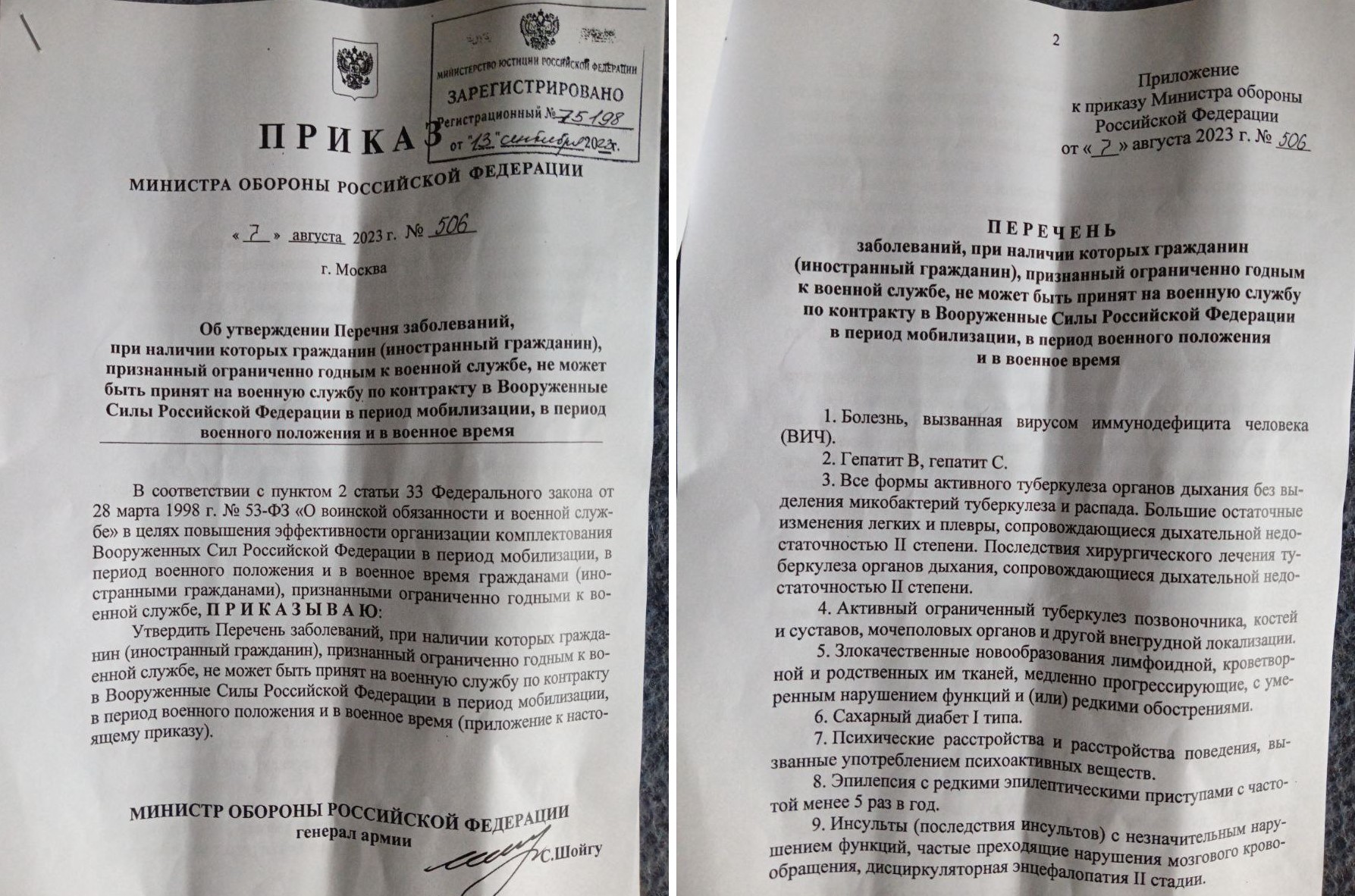 Алексей ссылается на приказ министра обороны №506, которым утверждается перечень болезней, носители которых не могут быть приняты на военную службу по контракту. В первых двух пунктах перечня – ВИЧ и гепатит С.