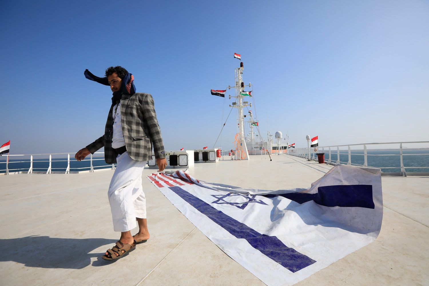 Yahya Arhab / EPA / Scanpix / LETA Житель Йемена на судне «Гэлакси Лидер», захваченном хуситами и переправленном в йеменский порт Аль-Салиф в ноябре. 5 декабря 2023 года
