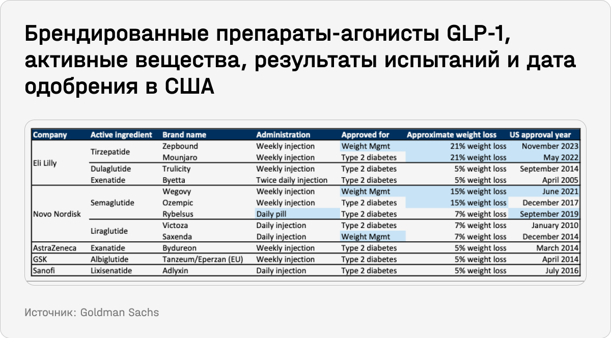 5. Препараты от ожирения. Акции Eli Lilly в 2023 году выросли почти на 60%. Благодаря ее новому лекарству от ожирения компания стала девятой по рыночной капитализации в S&P 500. Аналитики GS в отдельном отчете указывали, что у Eli Lilly, Novo Nordisk и их потенциальных конкурентов появляется возможность использовать наработки в области борьбы с ожирением для выхода на рынок медикаментов против целого ряда других заболеваний, в частности, болезни Альцгеймера, сердечно-сосудистых заболеваний и др.