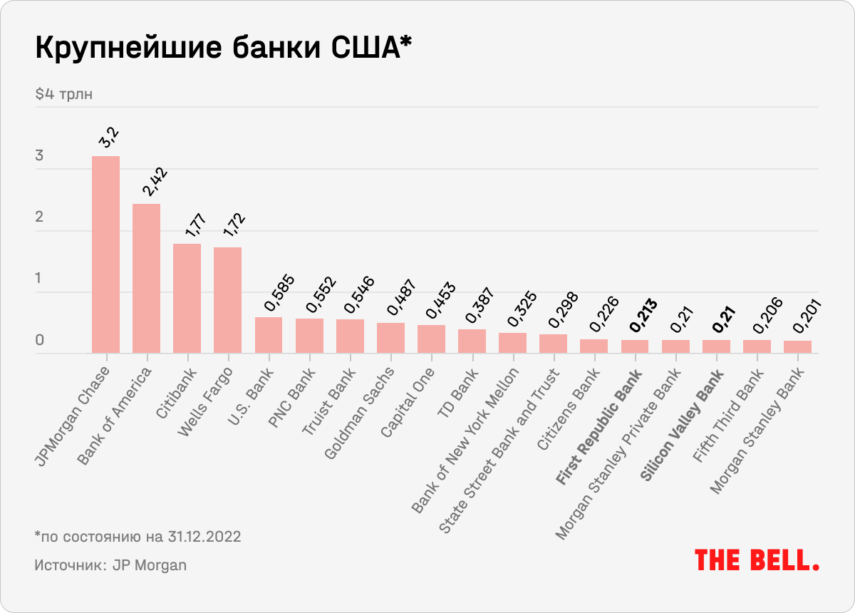 Пессимизм инвесторов объясняется тем, что в марте за пять дней обанкротились сразу три крупных банка США: Silicon Valley Bank, Signature Bank и First Republic Bank. Их активы в общей сложности составляли $532 млрд — это больше, чем было у 25 банков, рухнувших в 2008 году.