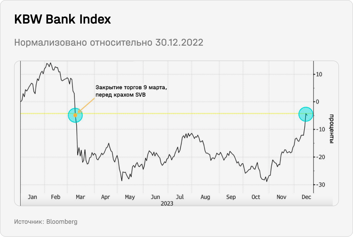 Из-за опасений по поводу кризиса многие банки в США и Европе по-прежнему недооценены. Но в ноябре–декабре акции американских банков вернулись к росту: ожидания более низких ставок снизили опасения по поводу нереализованных убытков в портфелях ценных бумаг банков и общего состояния экономики, отмечал Bloomberg.