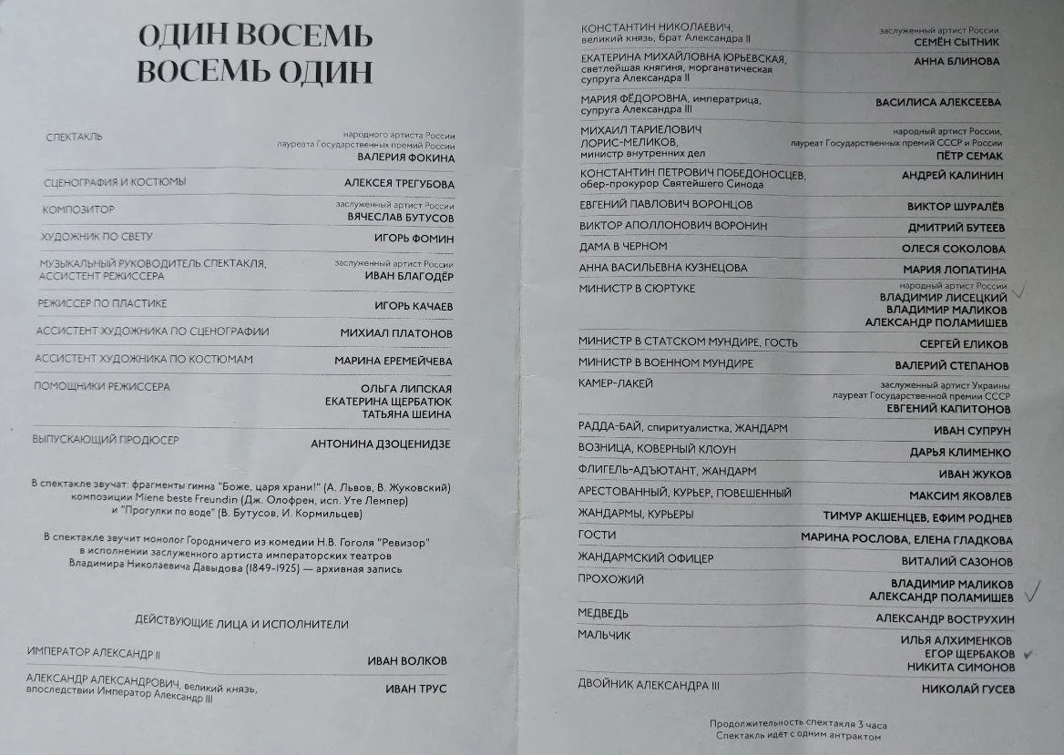 Александринский театр отменил запланированный на 12, 13 и 14 января показ одного из лучших своих спектаклей — «Один восемь восемь один», рассказывающий о последних днях царствования императора Александра Второго, его убийстве, первых днях царствования Александра Третьего и провале попытки осуществления хотя бы и небольших, но либеральных реформ.