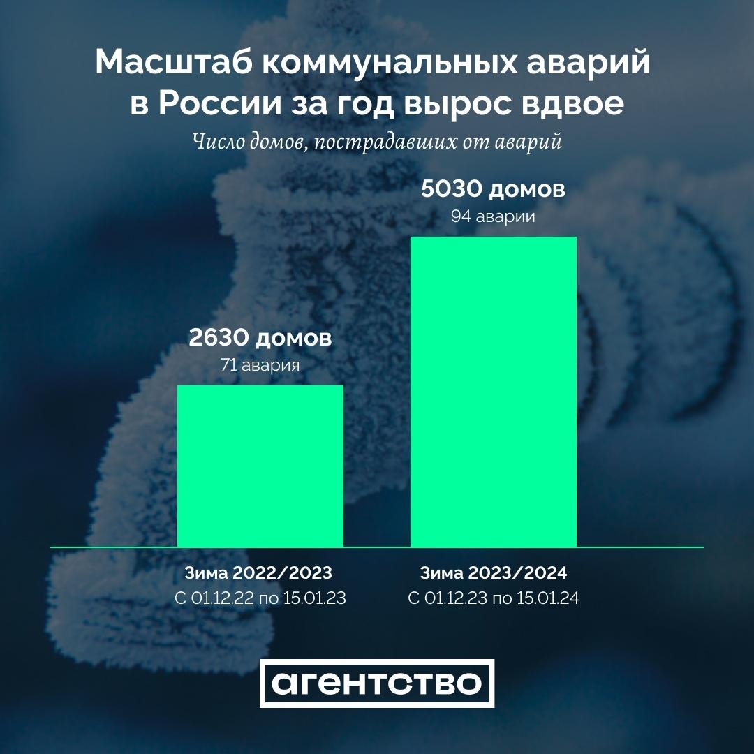 Еще существеннее увеличился масштаб последствий коммунальных ЧП. Зимой 2022–2023 годов с отключениями отопления столкнулись 2,6 тысячи домов в 31 регионе России. С начала декабря 2023 года аварии оставили без тепла более 5 тысяч домов в 34 регионах.