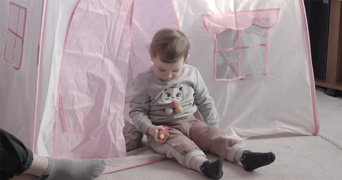 …Маленькая Лера, еще не разговаривающая, смотрит в игрушечную мобилу, что-то нажимает, прижимает к уху.