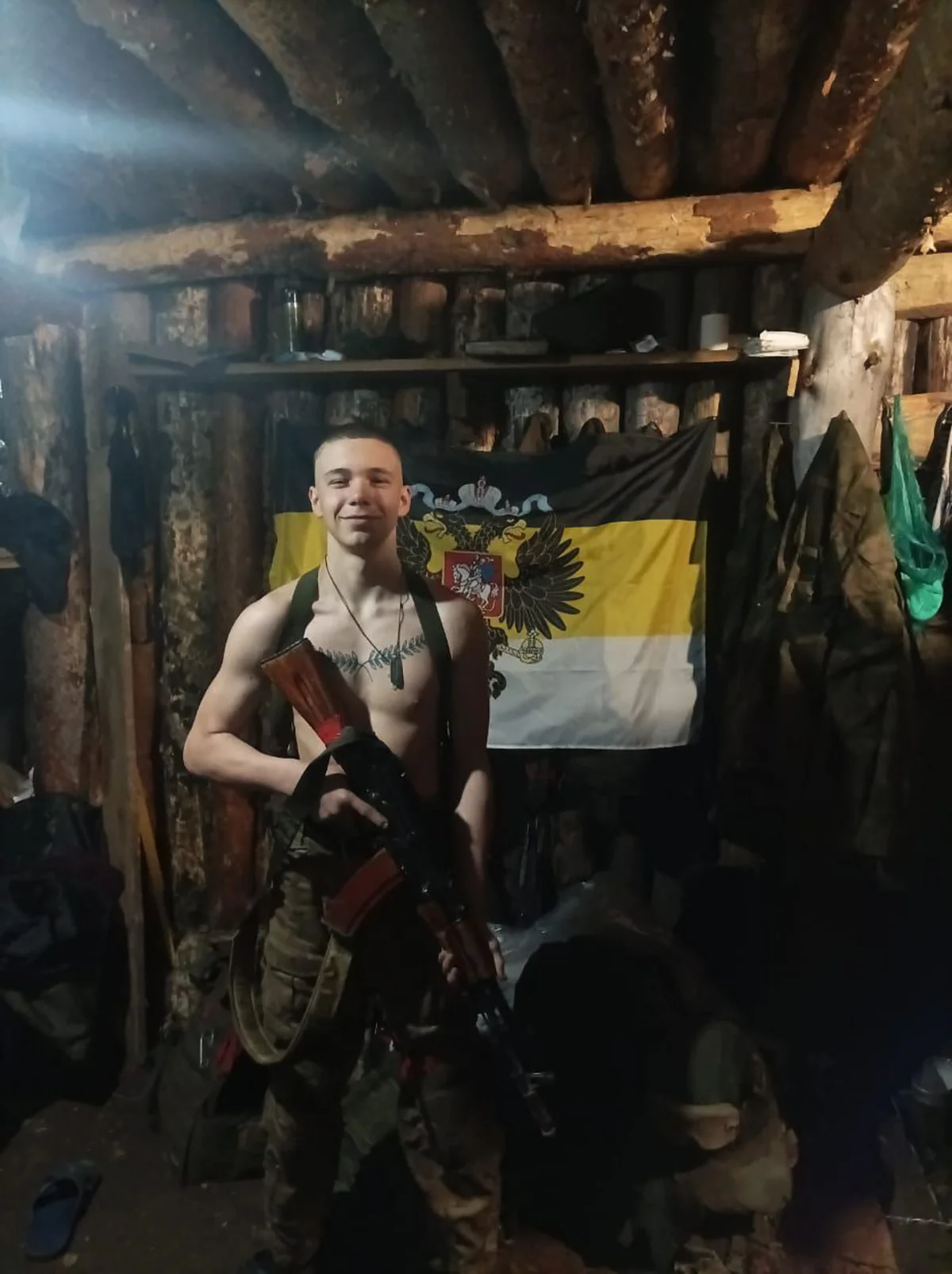 Вот фото Паши, присланное из зоны СВО — он позирует с автоматом на фоне имперского черно-желто-белого флага.