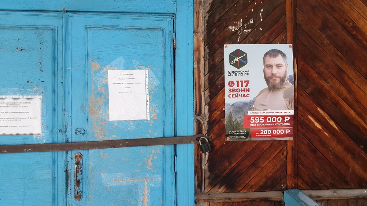 Предложения от МО: 495 тыс. единовременная выплата, от 200 тыс. — ежемесячно. Рядом другой плакат — набор бойцов в Сибирскую дивизию. Та же служба по контракту, но здесь при тех же ежемесячных 200 тысячах, при заключении контракта дают 595 тыс. И все это удостоверяет чем-то знакомое лицо. Точно: это Максим Богданкевич, ходил в горсовет Красноярска от КПРФ, был помощником депутата, предприниматель, теперь гвардии рядовой, участник СВО и, значит, лицо кампании по набору Сибирской дивизии.