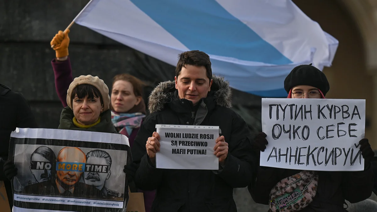 Представителей местной русской диаспоры в Кракове у памятника Адаму Мицкевичу в центре Кракова 25 февраля 2023 года. Фото: Artur Widak / NurPhoto / Getty Images