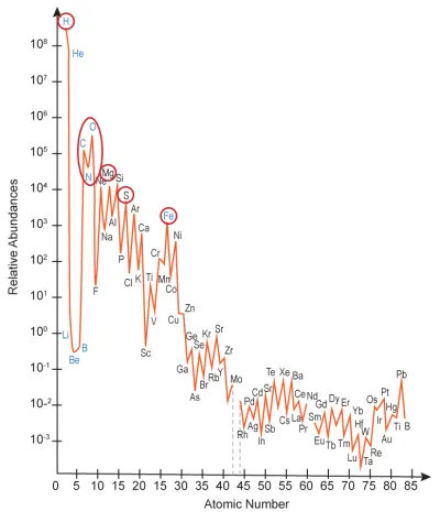 Что еще из интересных химических элементов? Бор — это элемент с интересной разнообразной химией, которая в последние годы как раз активно изучается. Бор находится в соседней с углеродом колонке таблицы Менделеева. У него основная валентность 3. Но в соединениях с азотом он может имитировать валентность 4 за счет донорно-акцепторных связей. И, чередуя атомы бора и азота, можно имитировать углеродную органику. Например, есть боразол — неорганический аналог бензола. А на основе бора без азота образуются свои интересные химические достаточно активные соединения с интересными структурами. Таким образом, жизнь на основе бора в лаборатории, наверное, можно сделать. А вот в природе бор так же, как и фтор, подводит ядерная физика. У него тоже не очень стабильное ядро, поэтому в условиях нуклеосинтеза в звездах бор не образуется, а наоборот, быстро превращается в более тяжелые элементы. И тот бор, который есть у нас на Земле и в межзвездном пространстве, образуется, насколько я помню, в основном в реакциях космических лучей с межзвездной материей. И это гораздо менее эффективно, чем нуклеосинтез в звездах. Естественную жизнь на основе бора мы тоже вряд ли найдем где-то во Вселенной. И вообще, если посмотреть на график распространенности химических элементов, можно увидеть, что наша земная жизнь выбрала самые распространенные: из первой десятки самых распространенных химических элементов — водород, гелий, кислород, углерод, азот, сера, магний, кремний, железо и неон, — она использует семь. Не попали только инертные газы — гелий, неон — и тот самый кремний, который не газ, но в соединениях с кислородом тоже химически инертен. А так и магний имеет важные функции в земной жизни (нуклеиновые кислоты и нуклеотиды всегда в растворе находятся вместе с ионами магния), и сера имеет важную роль в биохимии, и железо… Наша земная биохимия на самом деле довольно хорошо подогнана под доступность химических элементов во Вселенной, определяемую ядерной физикой. И альтернативную биохимию, альтернативную земной, надо искать, видимо, в пределах тех же самых химических элементов: кислорода, углерода, азота, серы, железа и т. д.