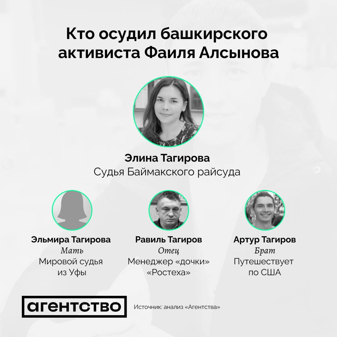 В среду судья Баймакского районного суда Башкортостана Элина Тагирова приговорила активиста Фаиля Алсынова к четырем годам колонии общего режима по делу о разжигании межнациональной розни, возбужденному по просьбе главы республики Радия Хабирова. Согласно анализу «Агентства», Тагирова является потомственной судьей — ее мать также работает в судебной системе республики. Отец судьи — менеджер одной из дочерних компаний «Ростеха», а брат работает актером Американского театра в Москве, любит путешествовать по США.