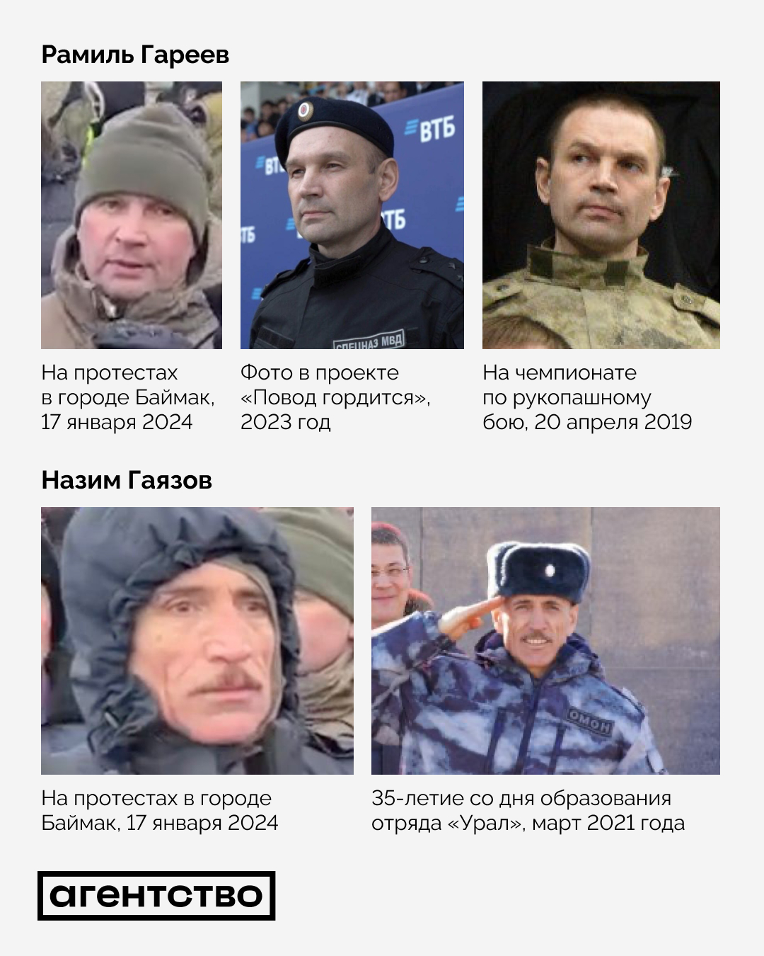 Среди силовиков, попавших на видео подавления протестов в башкирском городе Баймак, оказался глава отряда «Гром» управления Росгвардии по Башкортостану Рамиль Гареев, свидетельствует анализ «Агентства». «Гром» считается одним из лучших подразделений спецназа России, после мятежа Евгения Пригожина его передали Росгвардии. Также переговоры с активистами вел замкомандира регионального отряда ОМОН «Урал» Назим Гаязов.